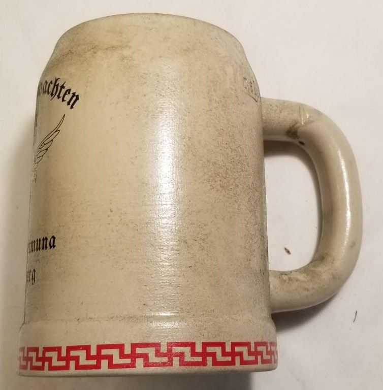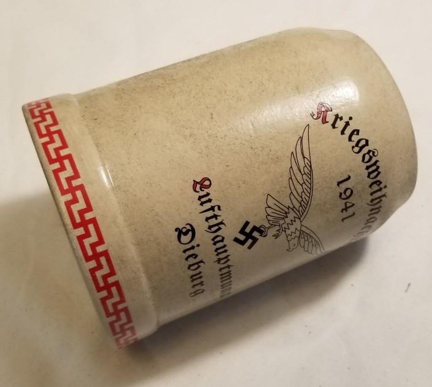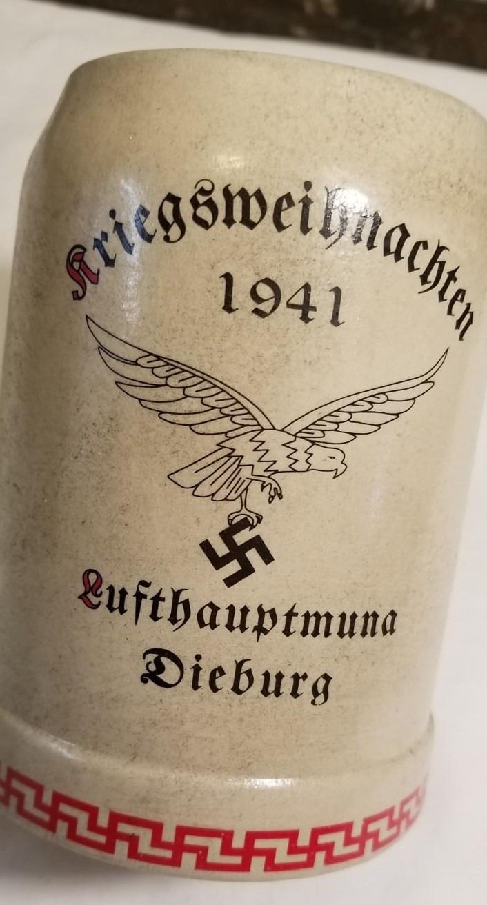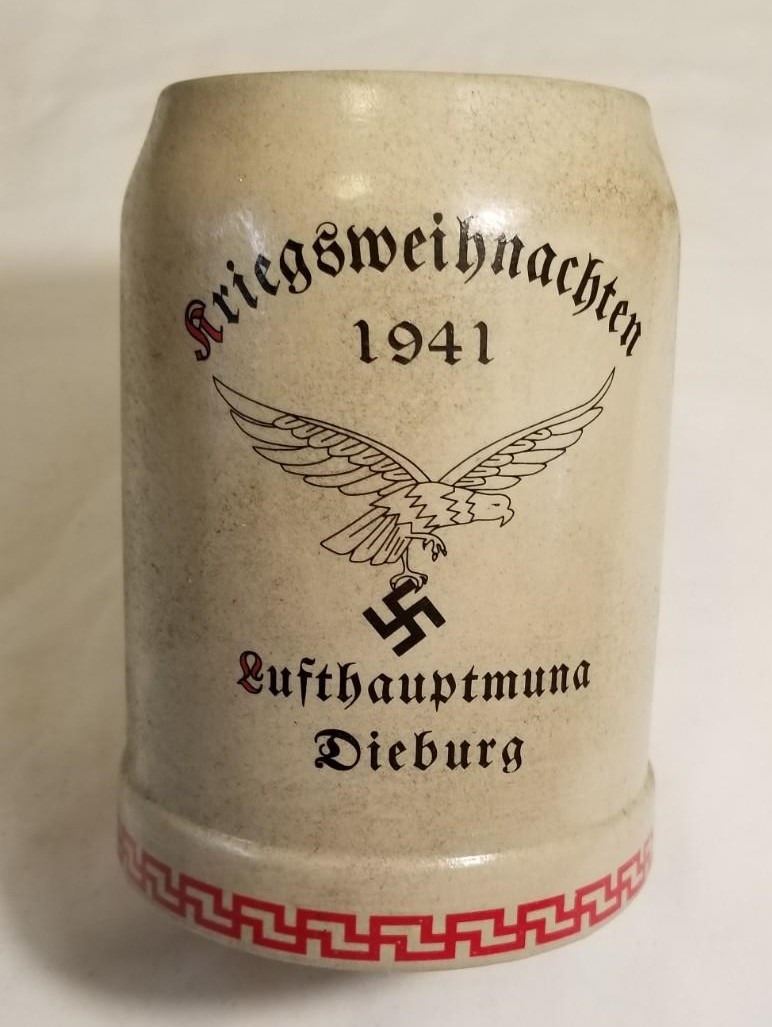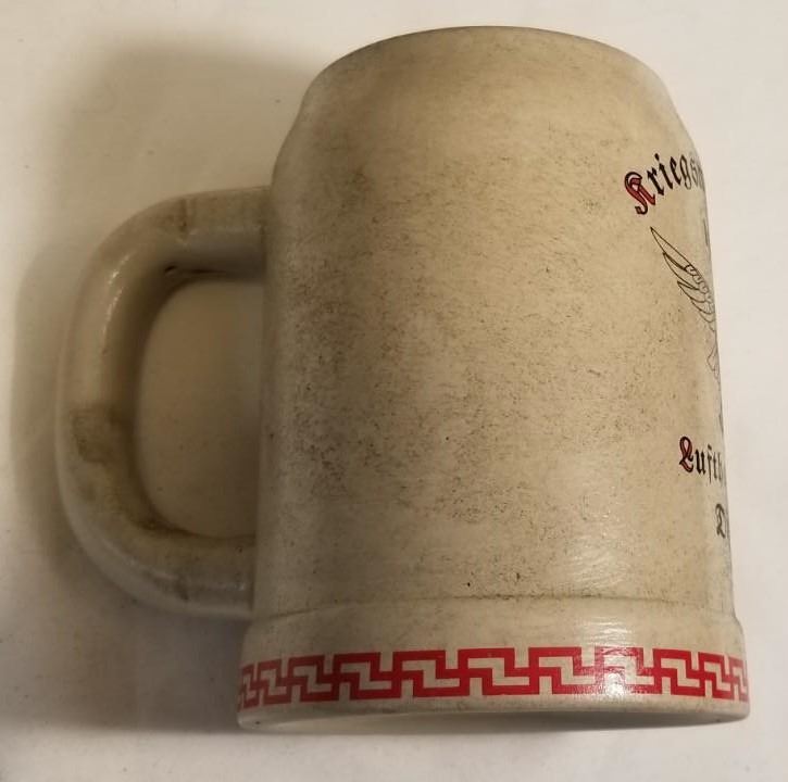 WW2 WWII Nazi German Third Reich Luftwaffe Beer Stein Mug Christmas 1941. Nice Third Reich Lufthauptuma Christmas Beer Stein or mug. Good condition, heavy ceramic with no chips or cracks. Nice swastika motiff band around the bottom, Maker marked as shown. Be sure and check out our other militaria and collectibles auctions for more military related items, we always combine shipping!