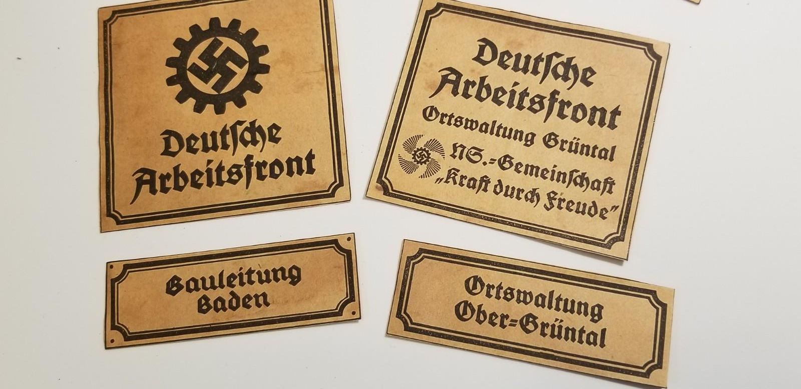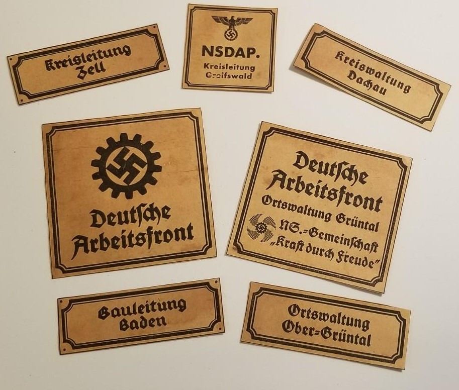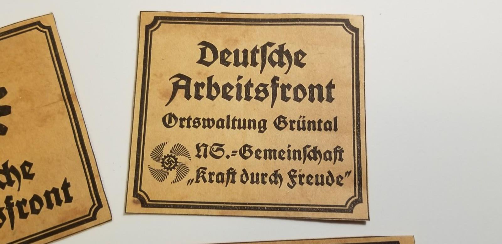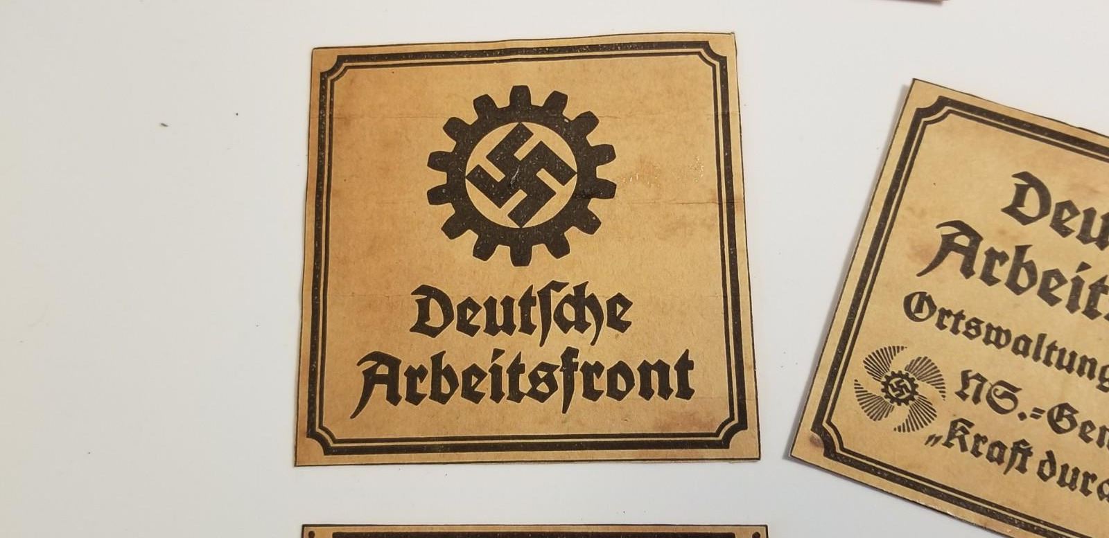 WW2 WWII Nazi German Third Reich NSDAP DAF Propaganda stamp paper lot Dachau. Interesting lot of NSDAP Deutsche Arbewitsfront paper stamps. Good condition lot with gummed backs. Possibly some kind of WHW items. Be sure and check out our other militaria and collectibles auctions for more Militaria, we always combine shipping!