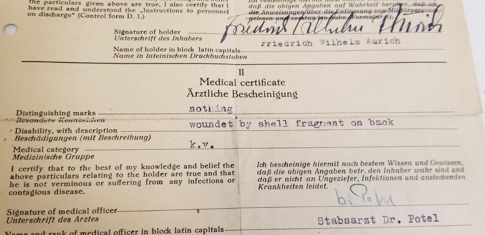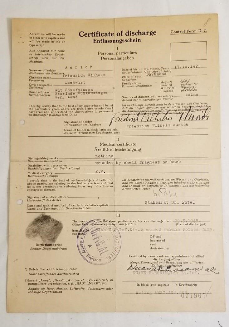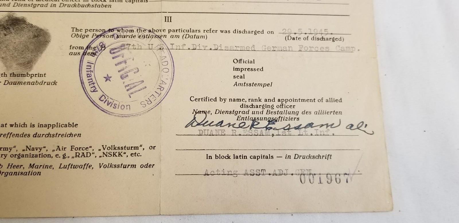 WW2 WWII US - Captured wounded German soldiers discharge paper. Interesting discharge paper from the end of the war, the German soldier was wounded and discharged from the hands of the US army. Nice document, condition as shown. Be sure and check out our other militaria and collectibles auctions for more military related items, we always combine shipping!