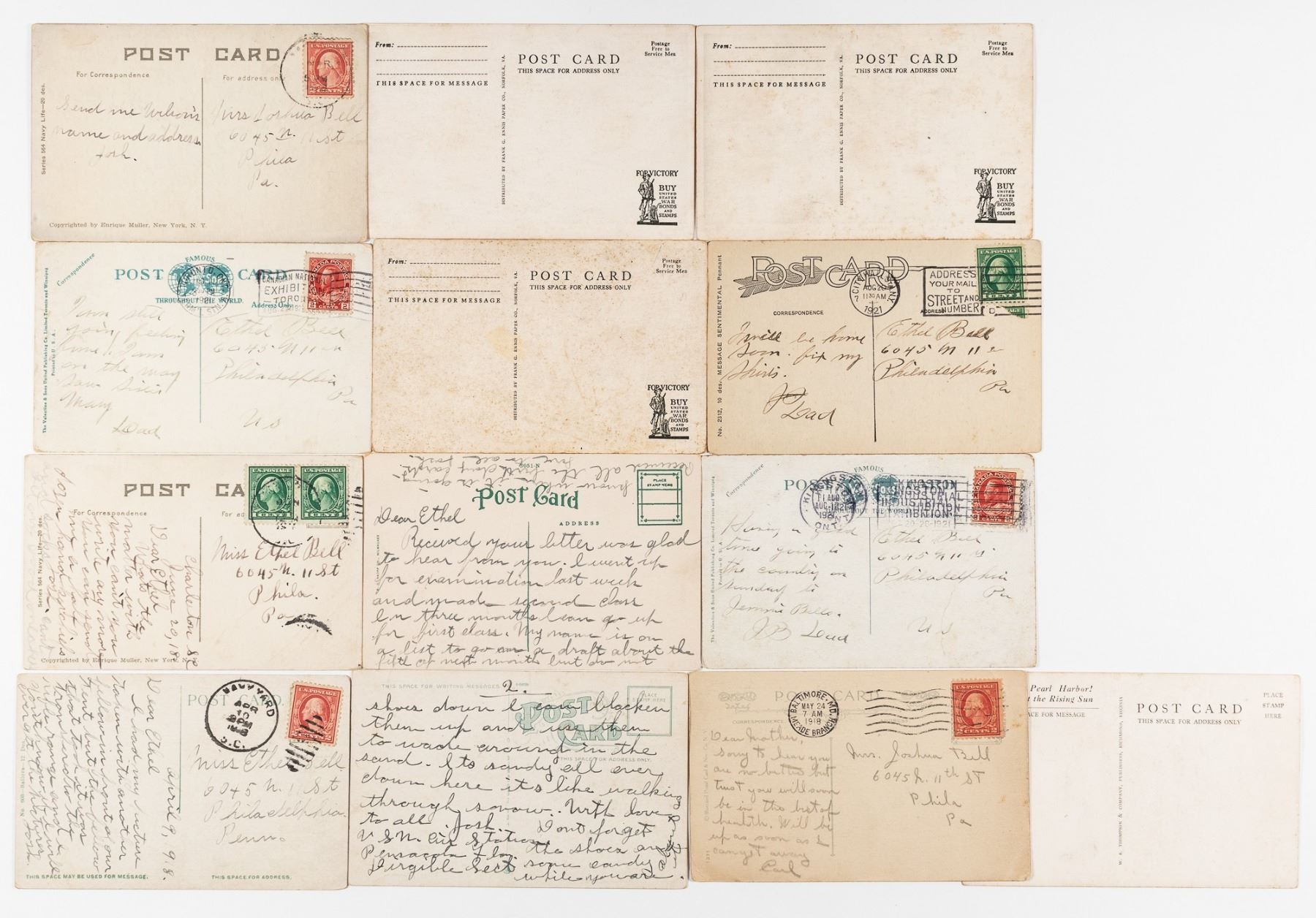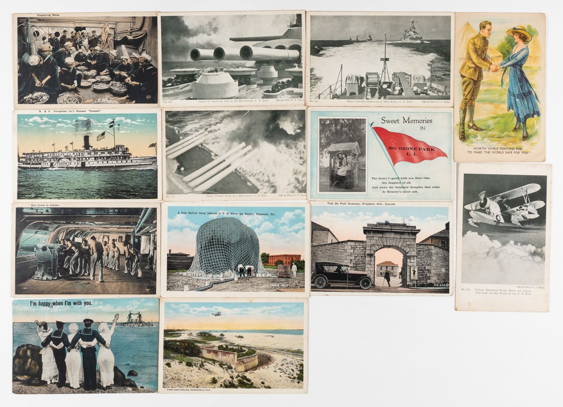 Twelve American postcards showing Naval soldiers and vessels addressed to women of the Bell family, 3.5 x 5.5 inches. Some postcards are postally used with inscriptions and ink stamps on verso.