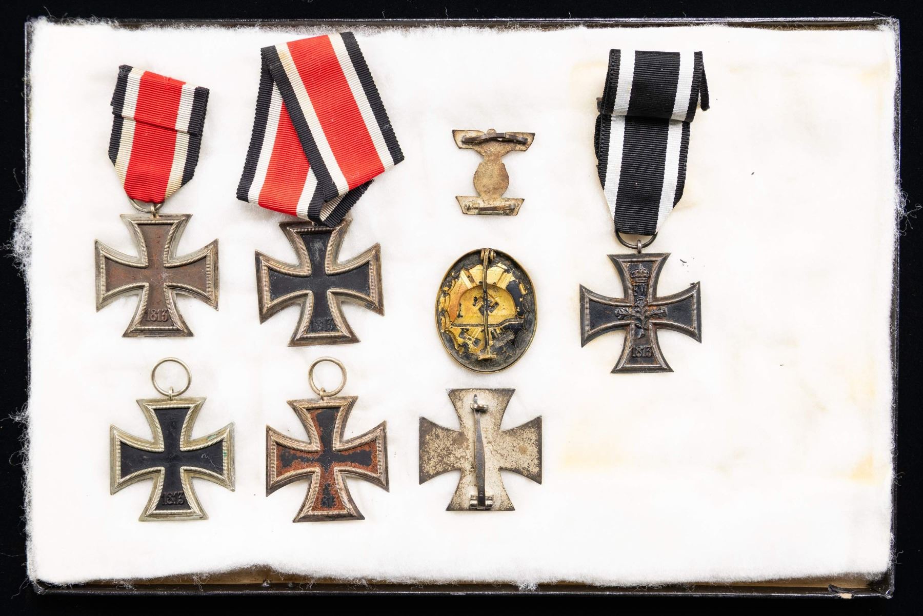 This WWI and WWII German lot consists of 2 WWII 2nd Class Iron Crosses with ribbons. / 2 WWII 2nd Class Iron Crosses without ribbons. / 1 WWII 1st Class Iron Cross with a wide pin. / 1 WWI 2nd Class Iron Cross with ribbon. There is a Spange attached to the ribbon with 4 angle cut flat wires on the reverse. / 1 Spange with 3 of 4 flat wires present. The tips of the wires are beveled. / 1 Black Wound Badge in brass with black finish remaining in the protected areas. CONDITION: all medals and awards show light wear unless otherwise noted. (02-24878-3/BF). $800-1200.