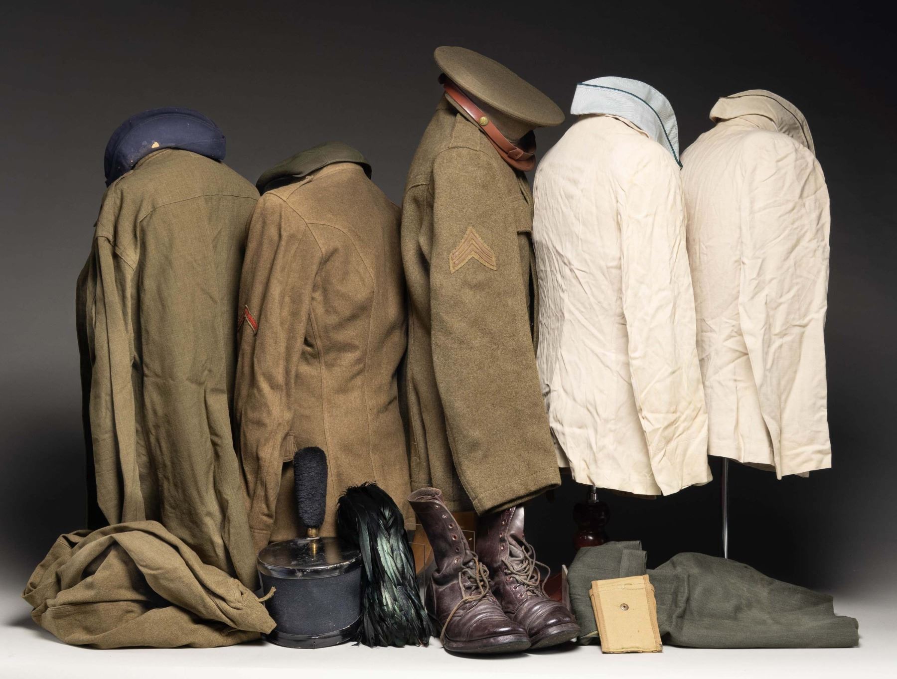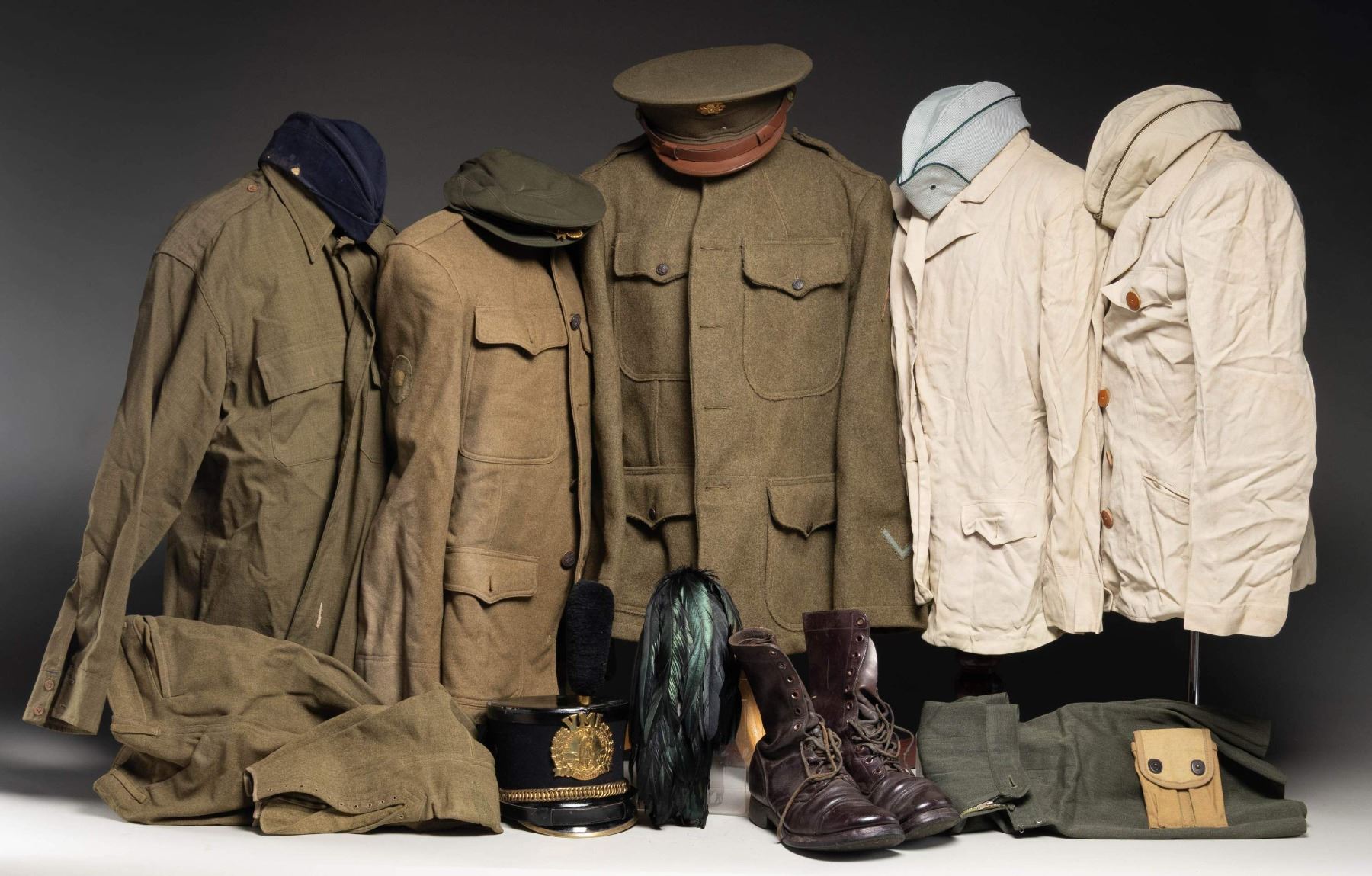 This lot has 1 WWI US enlisted uniform coat for a corporal with a blue chevron on the lower left sleeve and a red chevron on the upper left sleeve. The collar disks are "USNA" and company D of the 337th Artillery. / 1 WWI US uniform coat for a cook with a red chevron on the upper left sleeve and a blue chevron on the lower left sleeve. The collar disks are "US" and Company L of the 13th Infantry. / 1 Pair of enlisted pants with lace-up bottoms and several field repairs. / 1 Khaki cotton clip pouch for two M1911 clips. / 1 WWII enlisted visor cap. 3 WWII WAC overseas caps in navy, kahki, and green/white. / 1 WWII WAC hobby hat. / 1 pair of WWII US Army boots with a sole measuring 12". / 1 WWII WAC skirt. / 1 WWII winter wool shirt. / 1 Army Nurse Corps uniform coat with a tag that reads "REGULATION ARMY NURSE CORPS UNIFORM" and "Lt. COLLIE HODGES" in the sleeve. Coat has hard leather buttons. / 1 Army Nurse Corps uniform coat with a private label embroidered on the inside "Collie Hodges". No buttons. / 1 VMI bucket hat with black plume and black pom-pom. CONDITION: most items show light wear overall. Some uniforms have slight moth damage. (02-24057/BF). NON-GUN. $300-500.