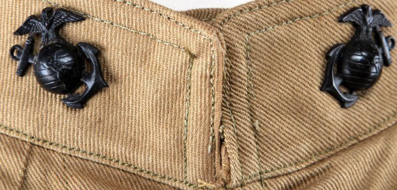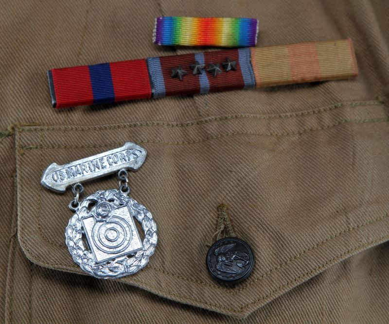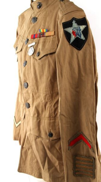 WWI Army issued tunic, with USMC buttons, patches, and chevrons. 2nd Division "Indianhead" patch on shoulder. Some staining to tunic, otherwise very good condition. Likely enhanced with period insignia.