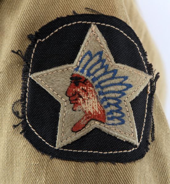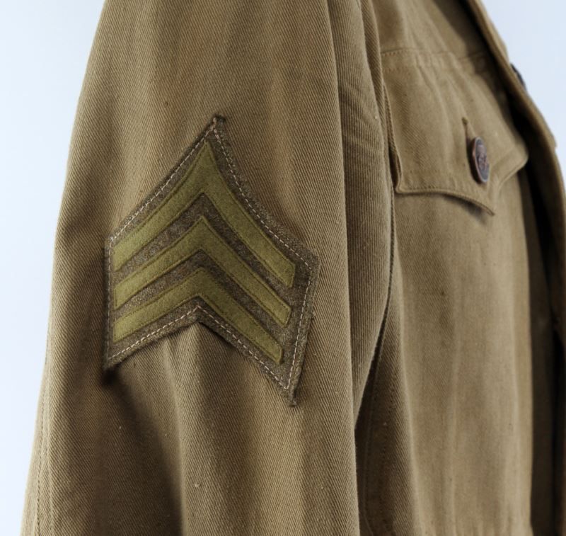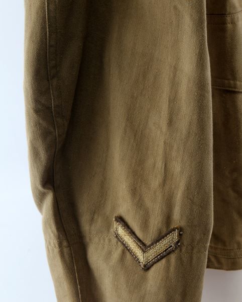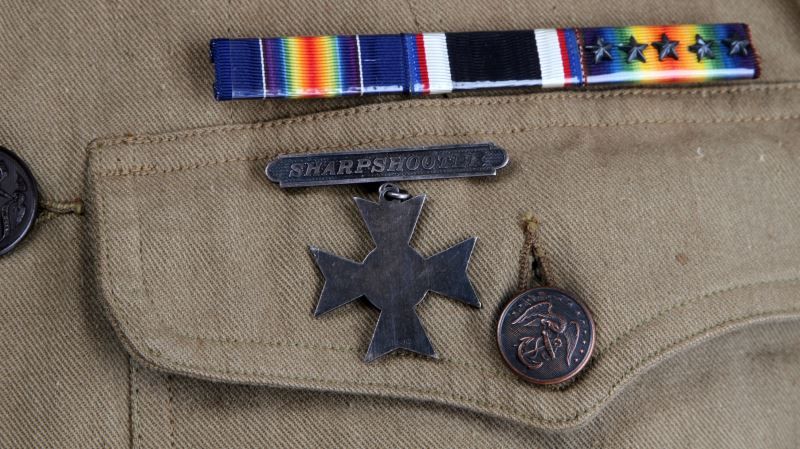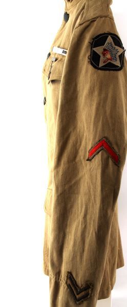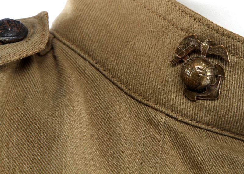 WWI Army style USMC issued tunic, with USMC buttons, 3 service ribbons (appear added), 5 stars, sharpshooter badge, discharge stripe, service stripe, wound stripe, period globes, and sgt. chevrons. Overall very good condition. Likely enhanced with period insignia.