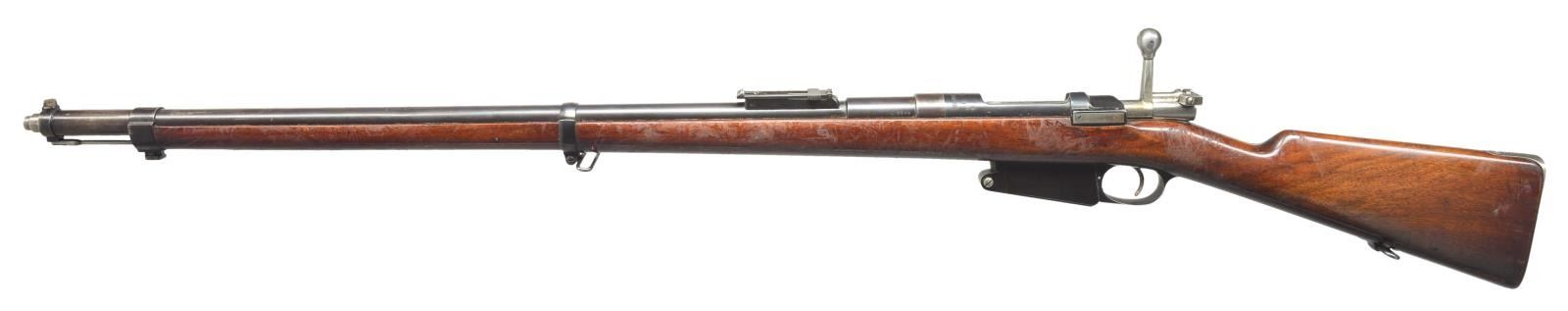 RIFLE. Cal. 7.65 Belgian Mauser. S# G8394. Bbl. 30 3/4". All visible numbers match except cleaning rod. Receiver ring marked "FABRIQUE NATIONALE HERSTAL-LIEGE". Straight bolt handle. Ladder rear sight graduated to 1900m. Inverted "V" front sight. Cleaning rod & bayonet lug are present. Walnut stock marked only w/ S#. Buttplate marked on tang w/ "M" & "5264" in addition to matching S# at rear. CONDITION: stock set has added lacquer finish as a preservative over professional restoration which has obscured marking roundel on right side of butt. Finish has wear, flaking & scratches. Metal has 70% original blue finish w/ thinning & wear, turning gray. Bbl. jacket has several notable sm. dents on top between bbl. bands. Good bore w/ lightly worn lands. (01-19364/RW). ANTIQUE. $1,500-2,000.