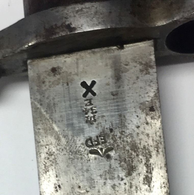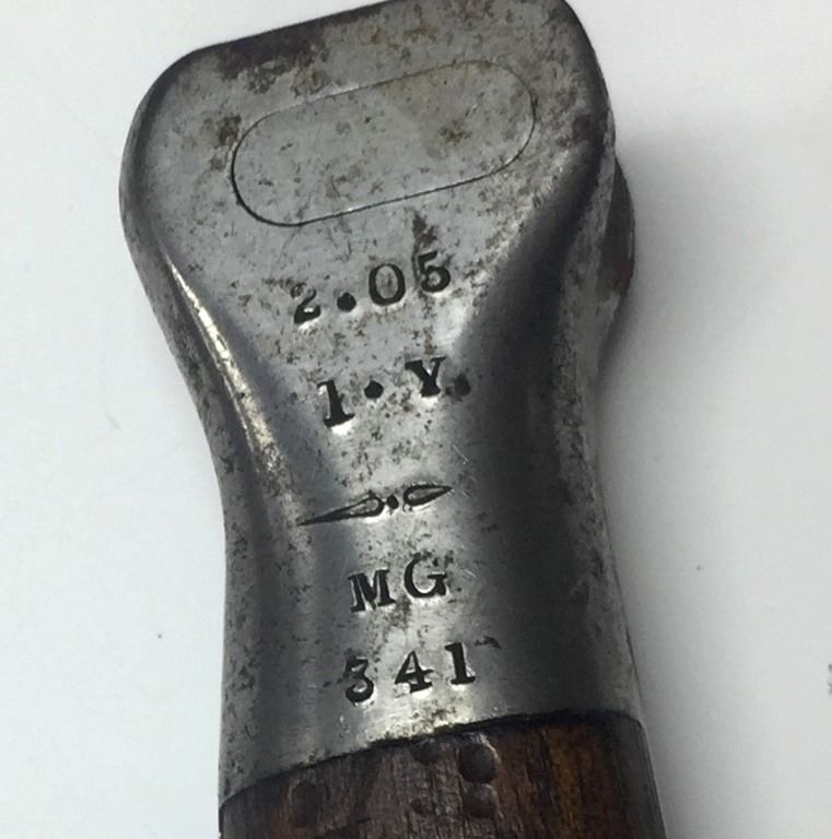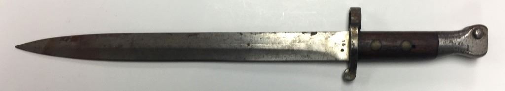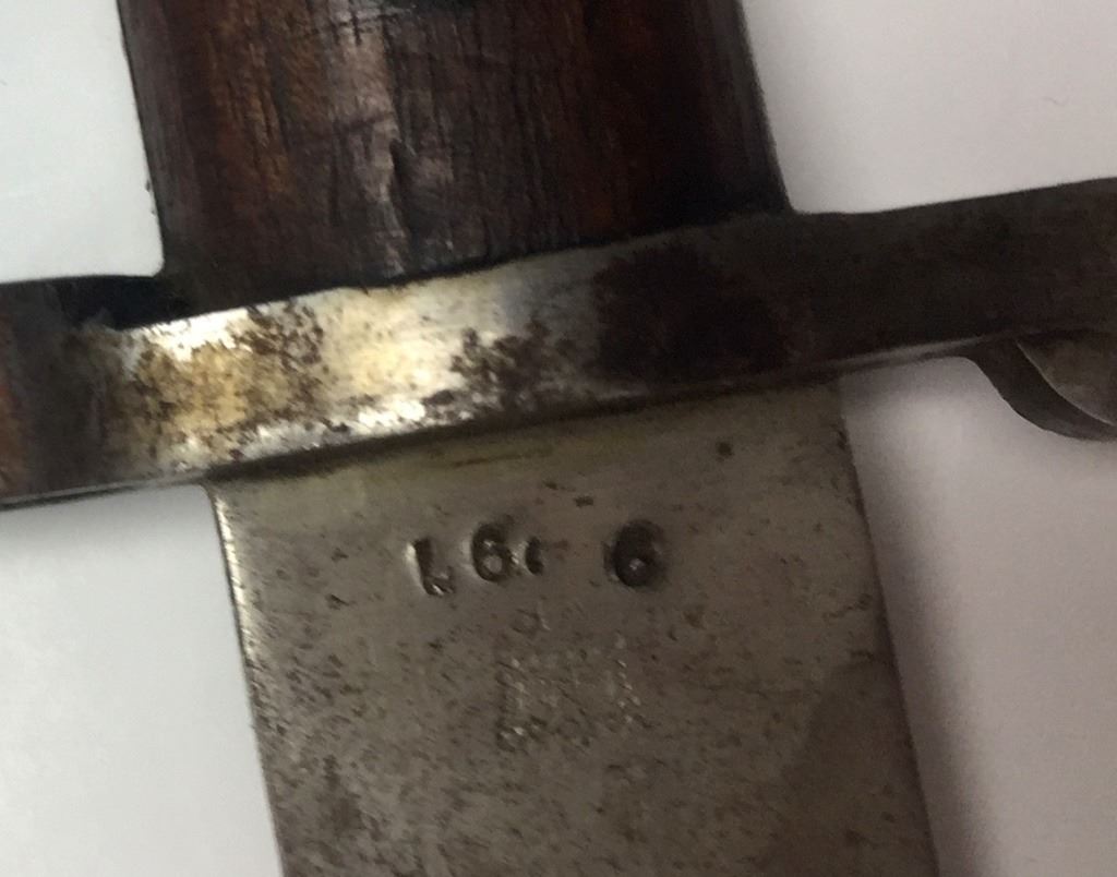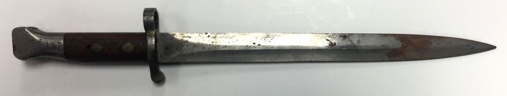 PATTERN 1888 MK III. DOUBLED EDGE BLADE WITH WALNUT GRIPS. NO SCABBARD. BLADE MARKED EFD M 34 E. REGIMENTAL MARKINGS ON HANDLE. 2.05 1Y MG 341. 424 MM TOTAL LENGTH (16.69 INCHES). SOME LIGHT SURFACE RUST ON THE BLADE THAT CAN