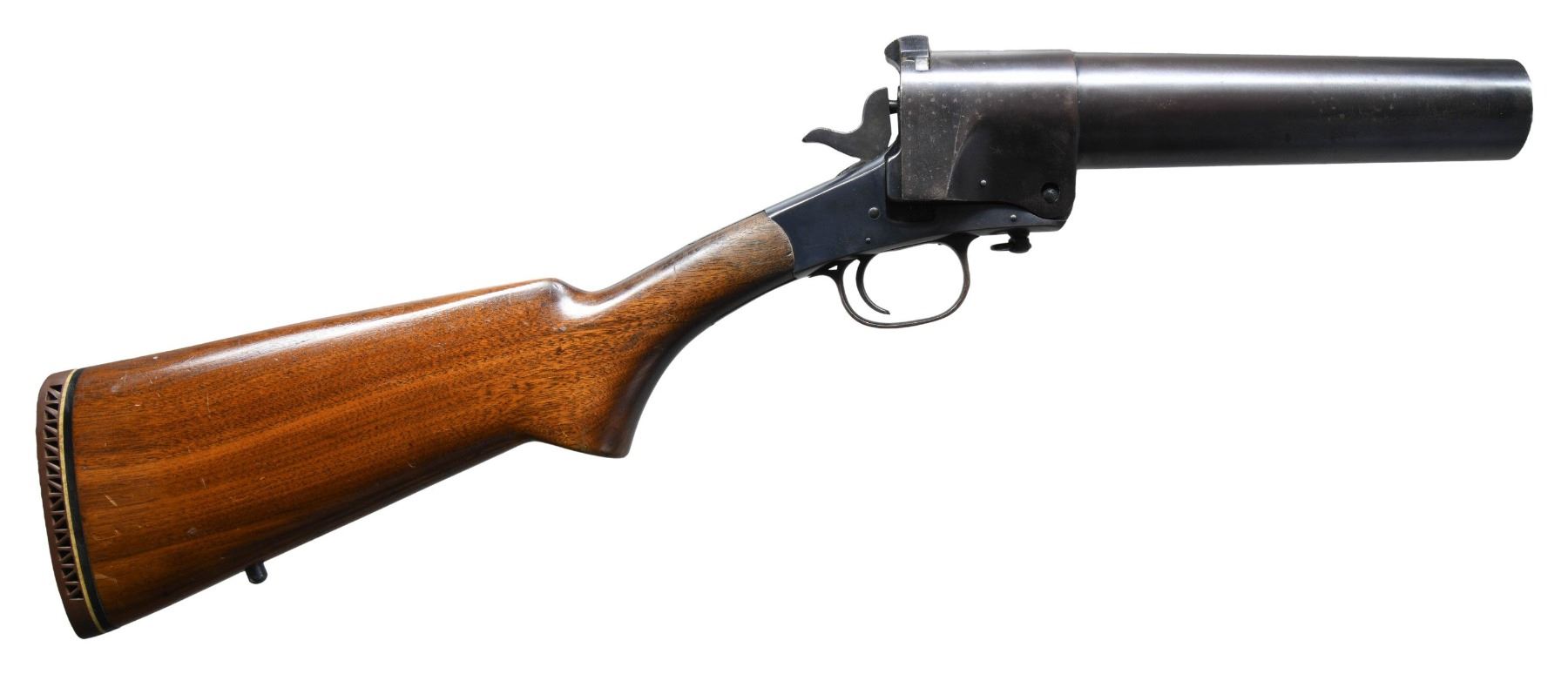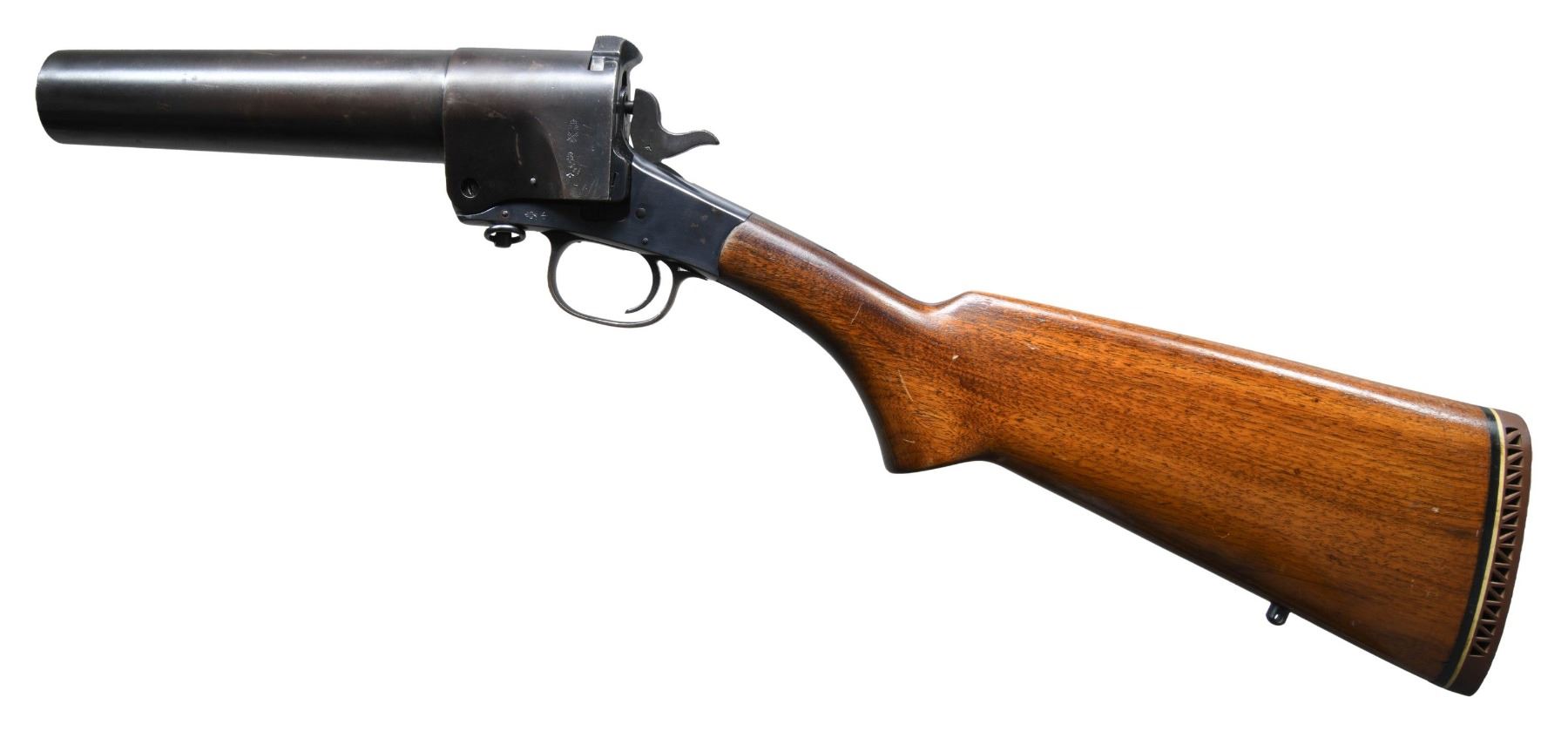 MK1 SINGLE SHOT SIGNAL GUN. Cal. 37mm. S# 986. Matching numbers on frame & barrel. Bbl. 10" smooth bore & made w/o sights. These guns were made under contract to Great Britain during WWI, WWII and are patterned after the Webley & Scott No.1 Mk1. Frame, barrel & latch marked w/ numerous British broad arrows & view marks. Exposed hammer design. Lanyard ring ahead of trigger guard. Walnut pistol grip buttstock, having added Pachmayr ventilated recoil pad & quick detachable swivel stud. CONDITION: stock has moderate wear & handling marks w/ added finish. Missing chip at end of upper tang. Fine crack extends from chip to buttstock nose. Two cracks at the bottom tang extending well into pistol grip. Metal retains 75% of its original worn blue finish. Barrel has small spots of oxidation throughout. Bore turning dark w/ scattered shallow pitting throughout. (02-25095/RW). NON-GUN. $400-600.