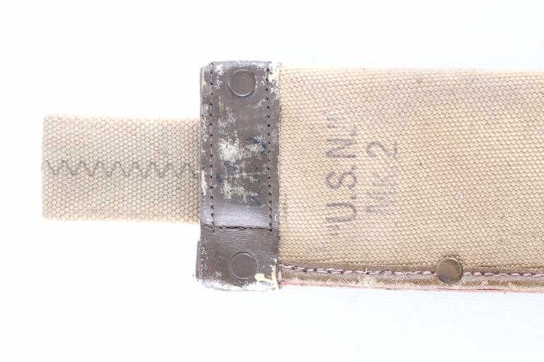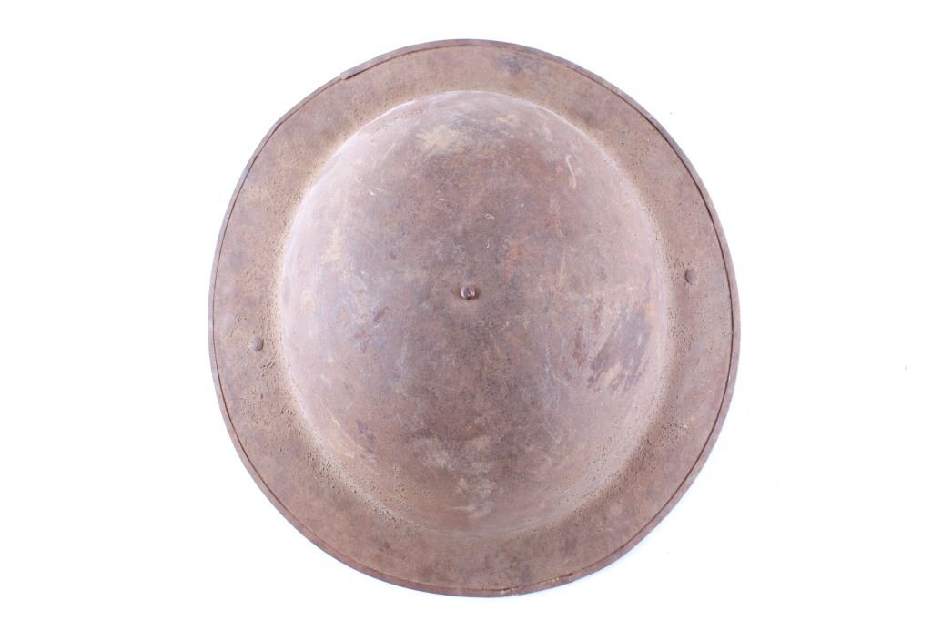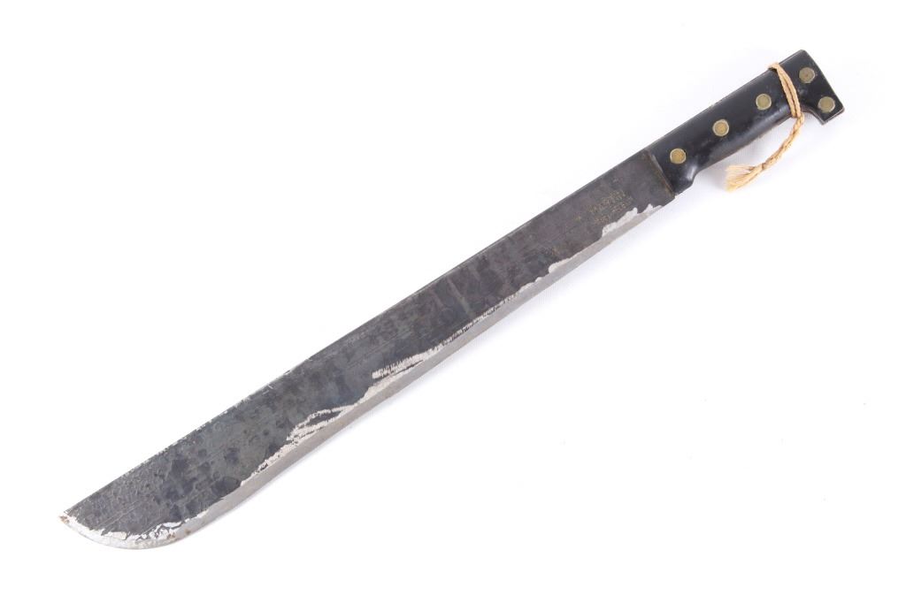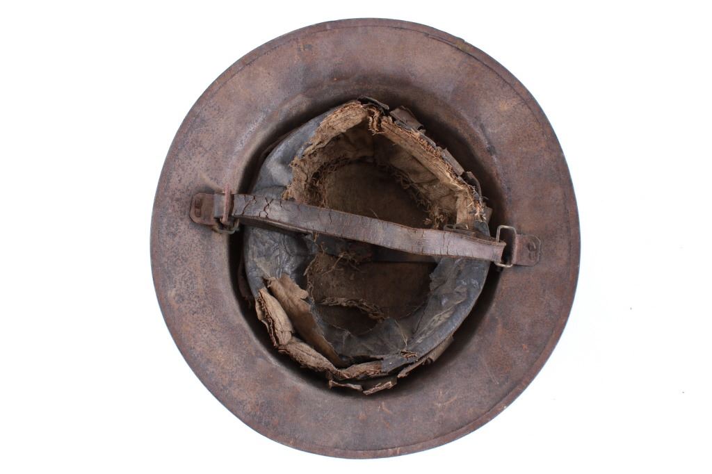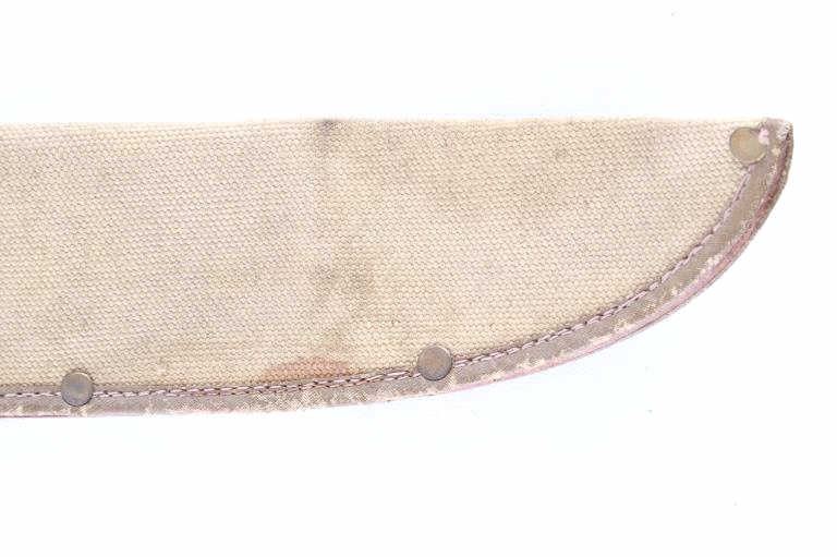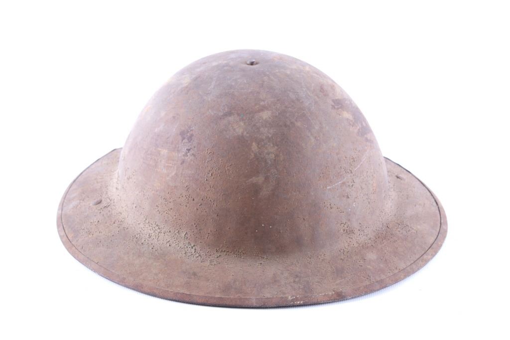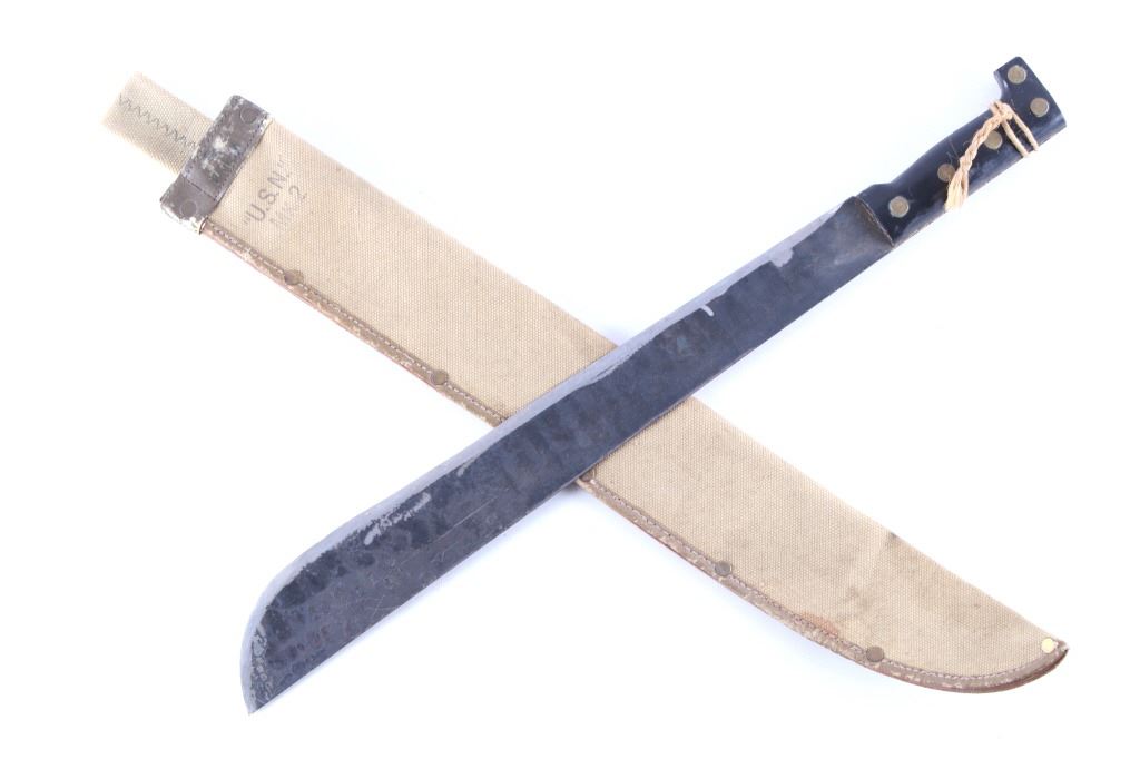 Offered in this lot is a British Mark 1 helmet from WWI (1914-1918) and a WWII Navy Martin Machete with canvas sheath. The helmet is a British Mark 1 (Brodie) and is identified as such by two items. The chin strap bales are attached to the helmet by a split rivet. The American bail is secured to the helmet’s skirt with a steel harness rivet. The British helmet also had an upgrade that was never adopted by the Americans. The British Mark I has a rubber ring, sometimes called a doughnut, sewn between two pieces of wool in the base of the helmet dome. The doughnut was added for the wearer’s comfort. The second item is a World War II (1939-1945) Martin Belgium-made machete with MK2 canvas sheath, used by the US Navy. This machete measures 22 3/4". The blade has been sharpened many times. The handle is tight and has brass rivets. The sheath is stained but features no rips or tears. The sheath has a belt loop and is marked ‘U.S.N. MK2’. These items show wear expected from age and use; please see photographs for assessment.
