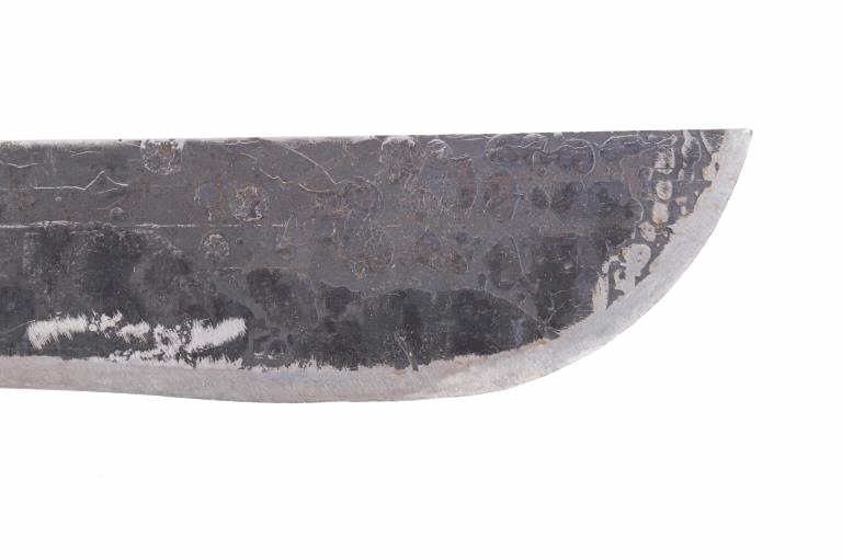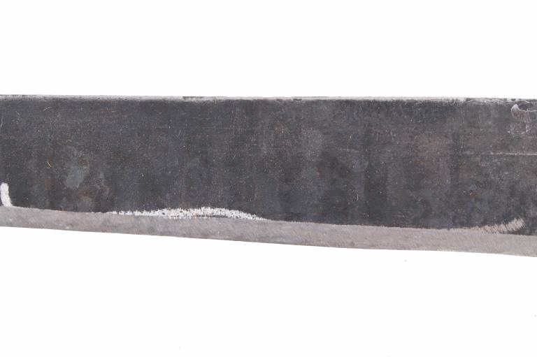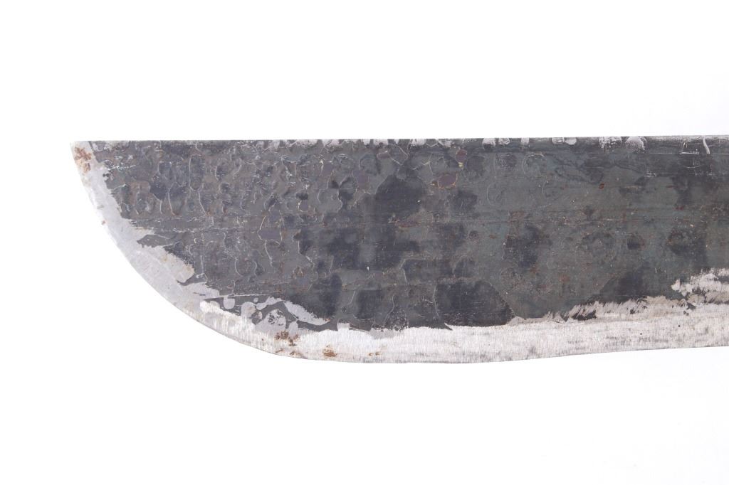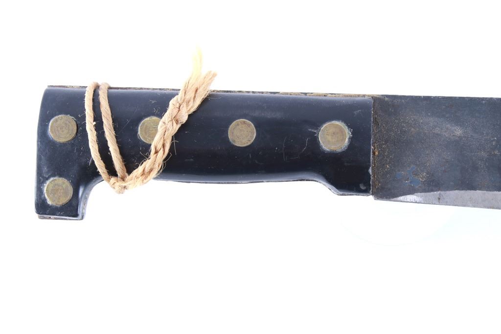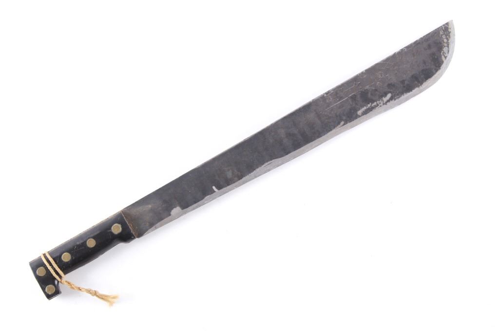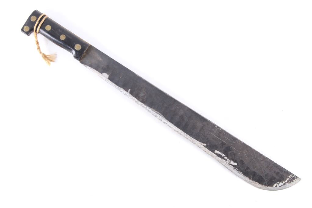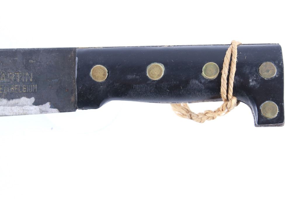 Offered in this lot is a British Mark 1 helmet from WWI (1914-1918) and a WWII Navy Martin Machete with canvas sheath. The helmet is a British Mark 1 (Brodie) and is identified as such by two items. The chin strap bales are attached to the helmet by a split rivet. The American bail is secured to the helmet’s skirt with a steel harness rivet. The British helmet also had an upgrade that was never adopted by the Americans. The British Mark I has a rubber ring, sometimes called a doughnut, sewn between two pieces of wool in the base of the helmet dome. The doughnut was added for the wearer’s comfort. The second item is a World War II (1939-1945) Martin Belgium-made machete with MK2 canvas sheath, used by the US Navy. This machete measures 22 3/4". The blade has been sharpened many times. The handle is tight and has brass rivets. The sheath is stained but features no rips or tears. The sheath has a belt loop and is marked ‘U.S.N. MK2’. These items show wear expected from age and use; please see photographs for assessment.