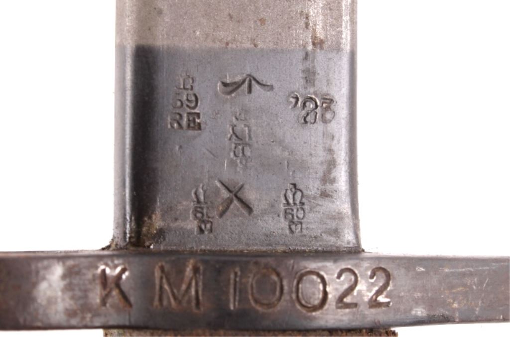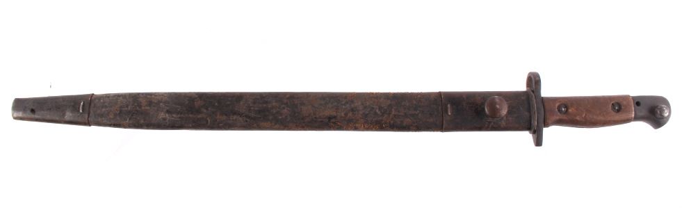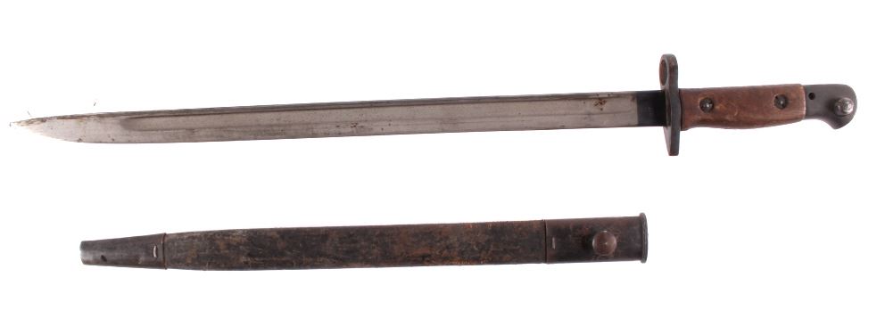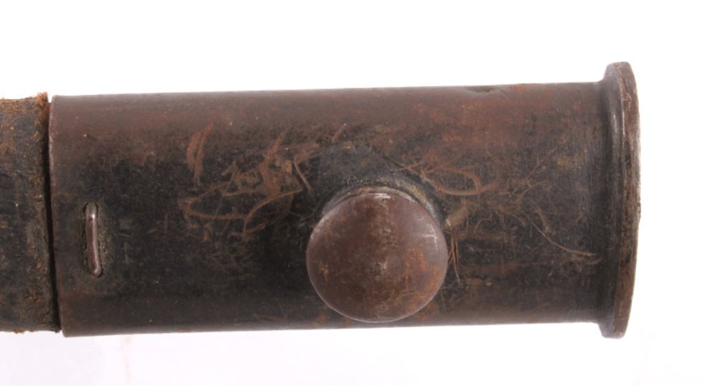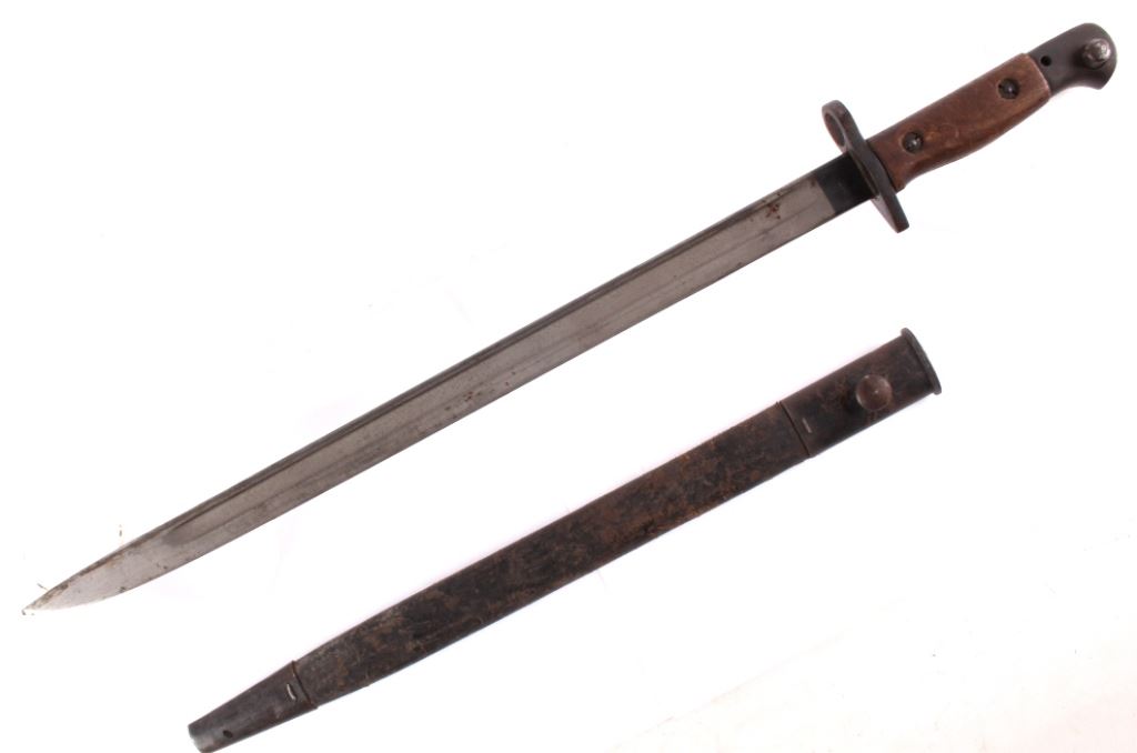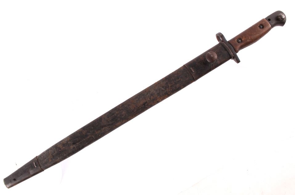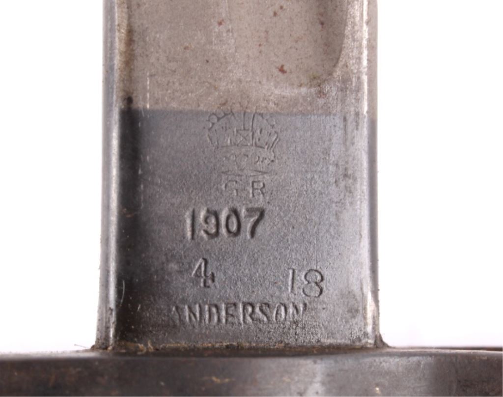 This is a World War I British Pattern 1917 Lee Enfield SMLE Bayonet made by Anderson. The bayonet is in the original leather and metal scabbard. Model P-07. Rare knife possibly re-issued in World War II. Overall is 22 5/8" with a 16 7/8" blade.
