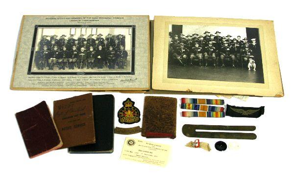 A WWI continuing to WWII archive of Sgt. James Dalziel of the 8RD. Fought during the First War, surviving though wounded, and later a member of the Saskatchewan Legion of Frontiersman. This grouping has his ribbon rack, group photos of his Legion in 1941, pay record, separation in WWI from the CEF document and more. Among of the most interesting items are 2 diaries. One from the Canadian Trench Warfare School stamped and dated October, 1917, it is hand written and consists of Sgt. Dalziel's notes of his training, dealing with gas attacks, grenade disarming and much more. A detailed accounting of WWI trench war fare training.