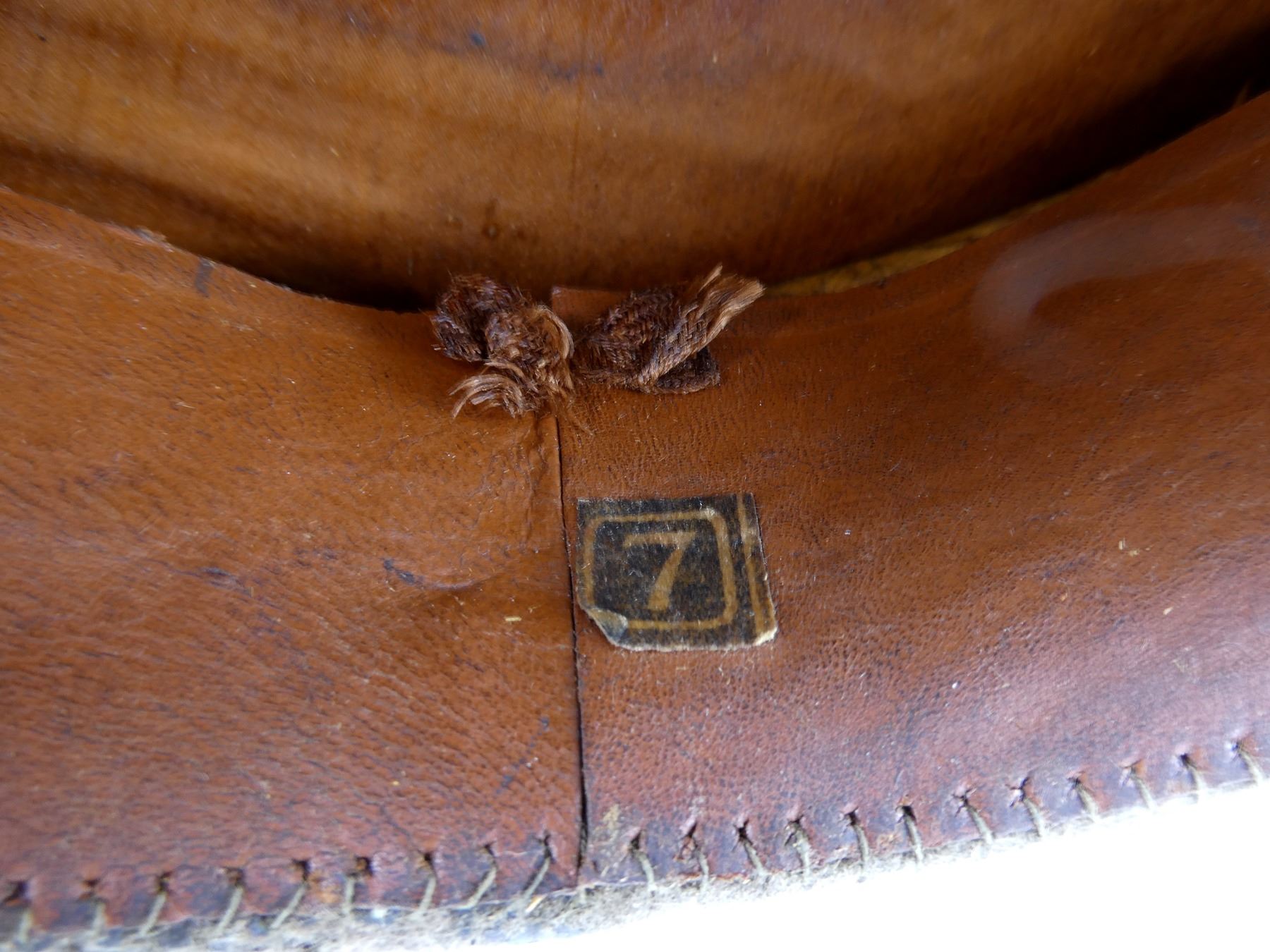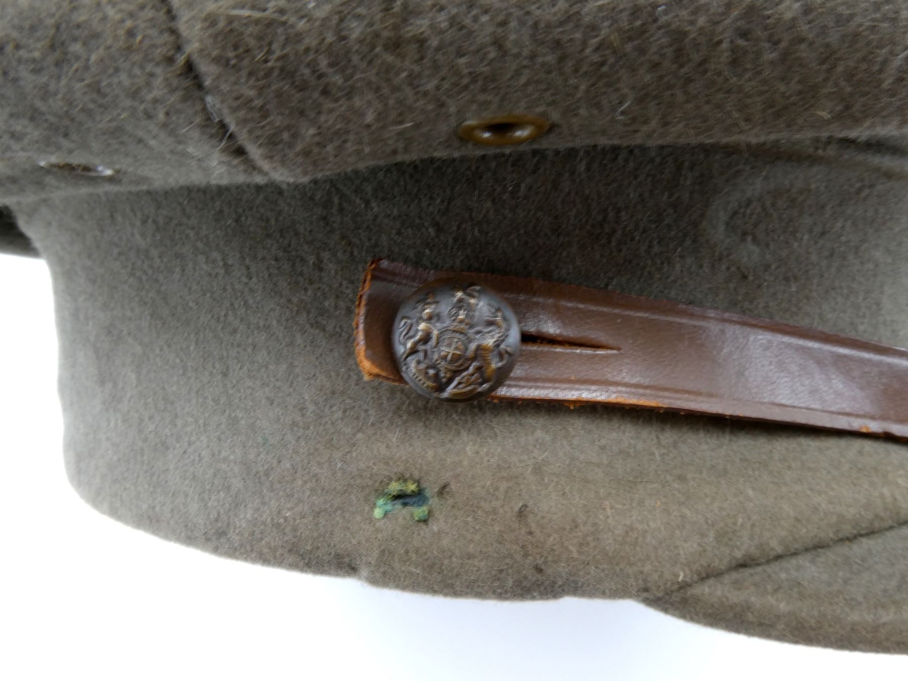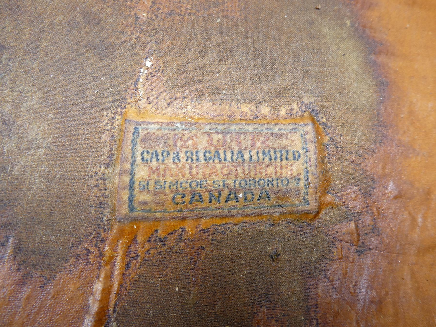 (1) OLIVE WOOL SERVICE DRESS CAP, LEATHER CHIN STRAP, BUTTONS WITH KING'S CROWNS, SIZE 7, LEATHER HEAD BAND, MARKED: "CAP & REGALIA LIMITED, MANUFACTURERS, 51 SIMCOE ST. TORONTO, CANADA", SHOWS AGE / WEAR / TEAR. SEE PHOTOS.