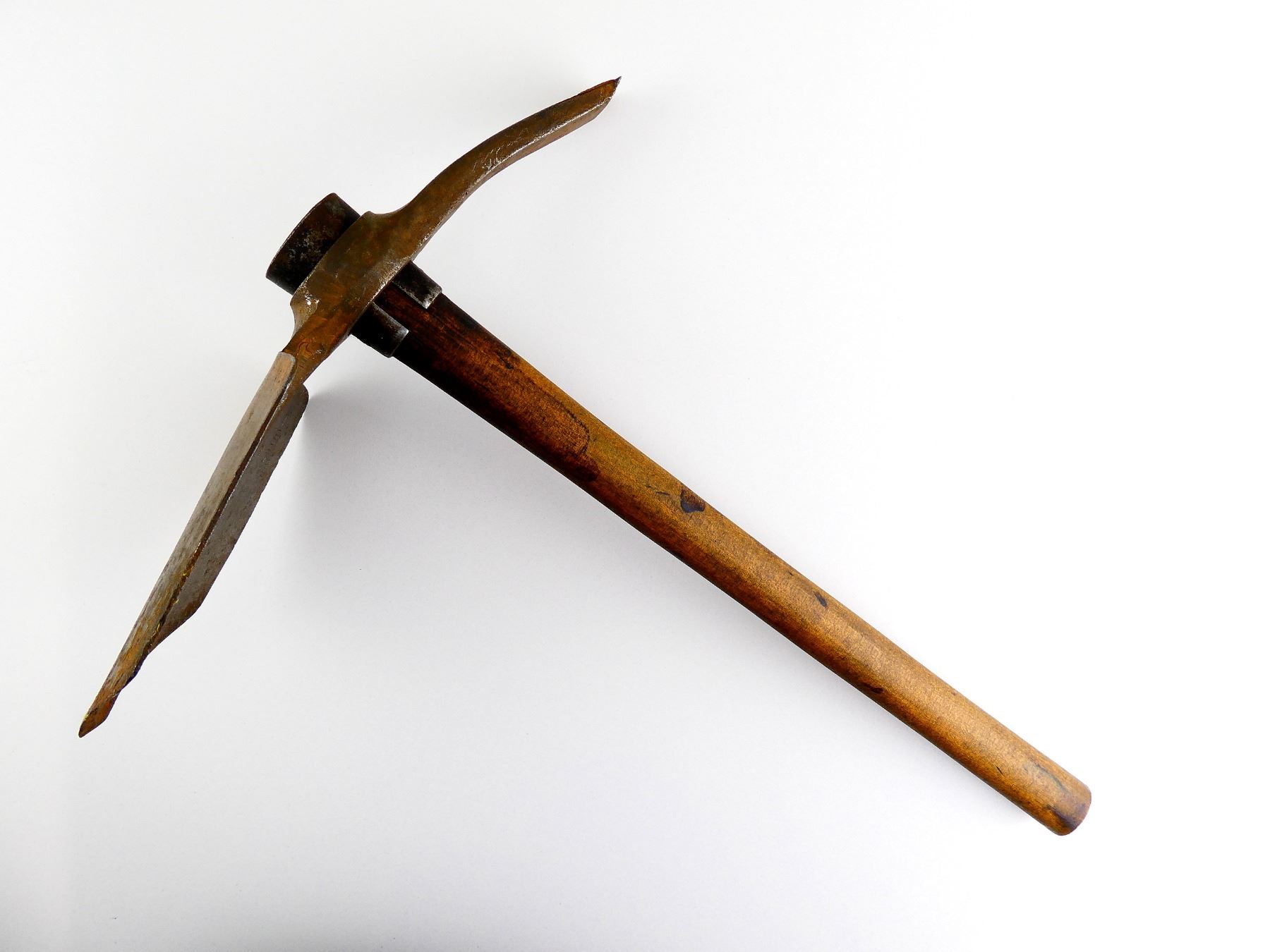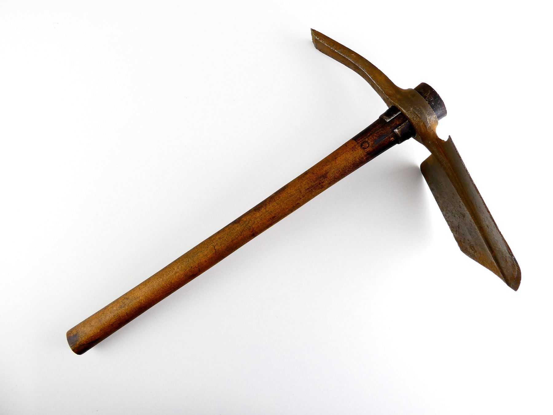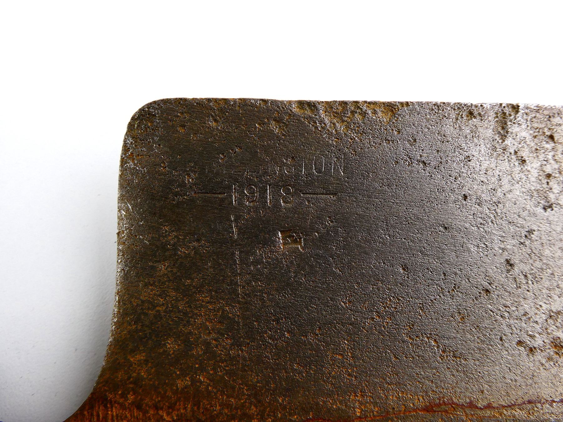LOT INCLUDES; (1) STEEL TOOL HEAD, SPADE ON ONE SIDE / PICK ON THE OTHER, MARKED: "?????INGTON, 1918", "F", BROAD ARROW & "46", APPROX. 5" W, OAL APPROX. 12 1/8" & (1) WOOD HELVE WITH STEEL, HANDLE MARKED WITH C-BROAD ARROW, OAL APPROX. 16 5/8". SEE PHOTOS.