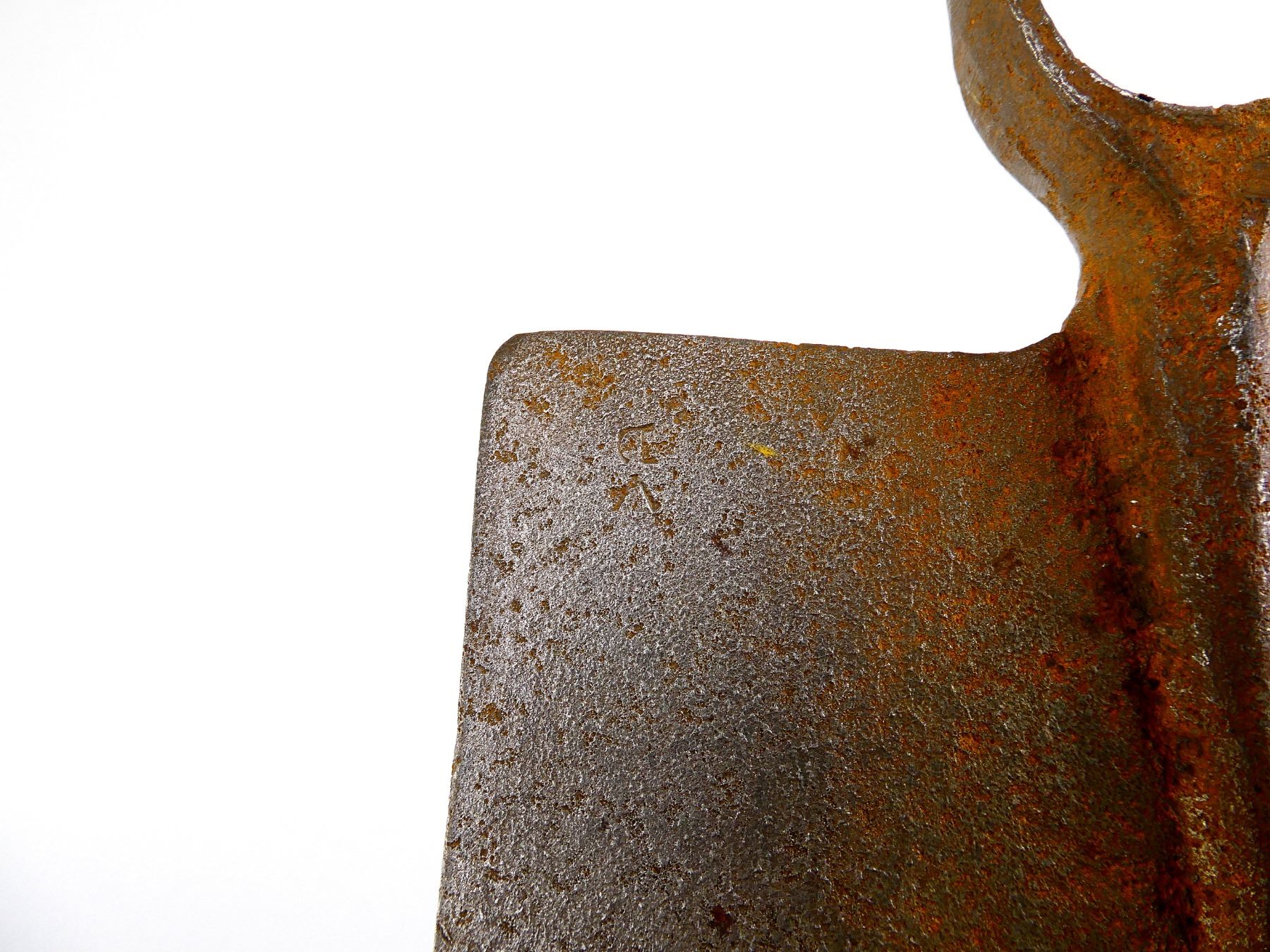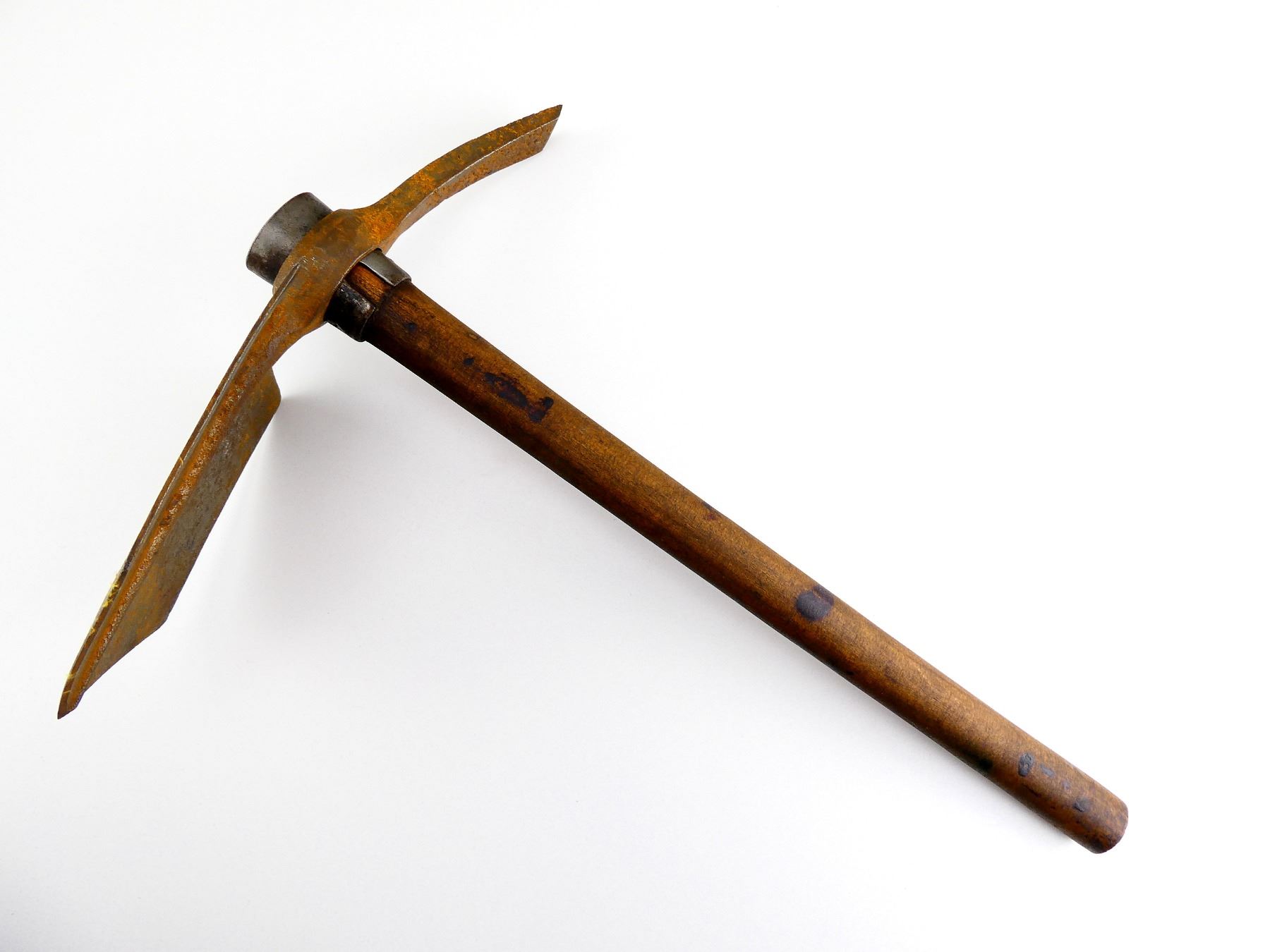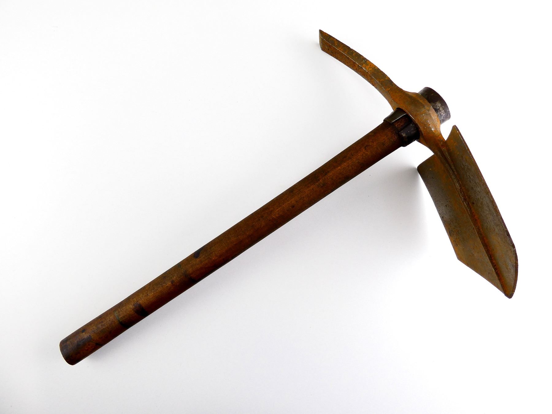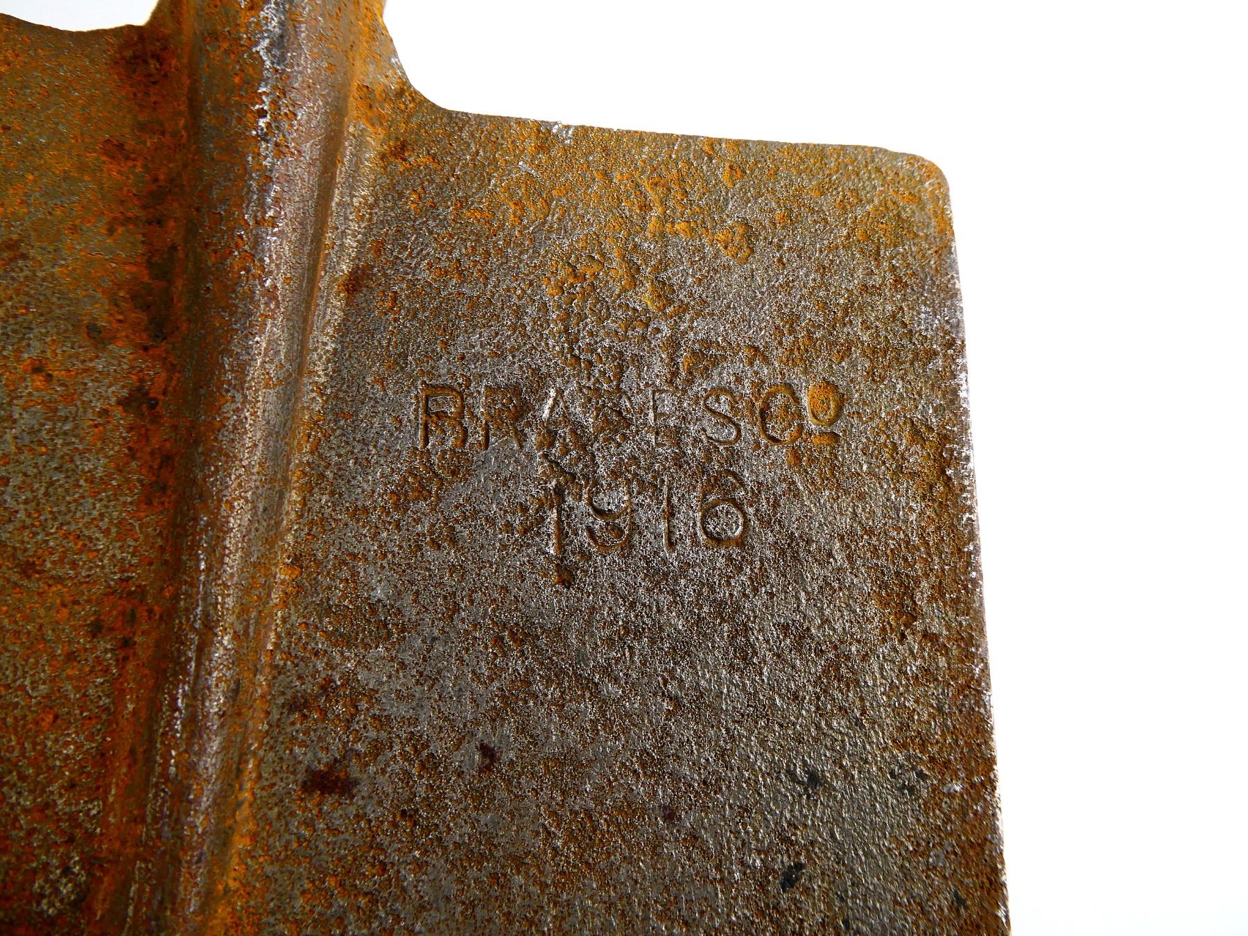 LOT INCLUDES; (1) STEEL TOOL HEAD, SPADE ON ONE SIDE / PICK ON THE OTHER, MARKED: "BRADES CO, 1916", BROAD ARROW, "D", APPROX. 5 1/8" W, OAL APPROX. 12" & (1) WOOD HELVE WITH STEEL, HANDLE MARKED WITH C-BROAD ARROW, OAL APPROX. 16 5/8". SEE PHOTOS.