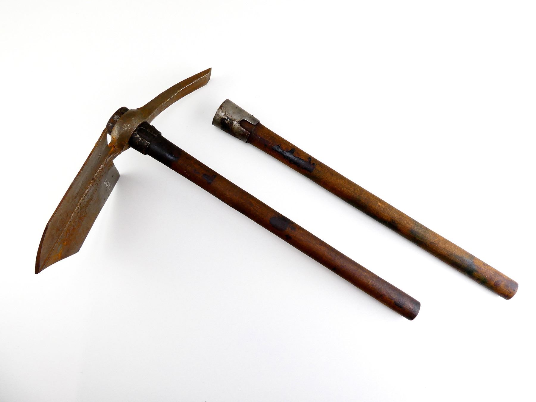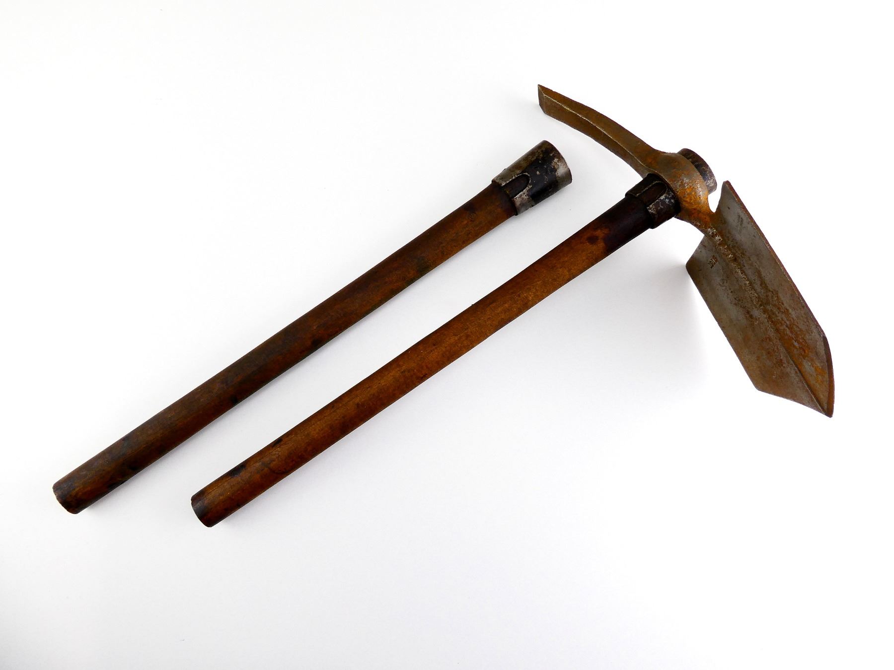 LOT INCLUDES; (1) STEEL TOOL HEAD, SPADE ON ONE SIDE / PICK ON THE OTHER, MARKED: "J. YATES & CO., BIRMINGHAM", "1916" & BROAD ARROW, APPROX. 5 1/8" W, OAL APPROX. 12.25" & (2) WOOD HELVES WITH STEEL, HANDLES MARKED WITH C-BROAD ARROW, OALS APPROX. 16 5/8". SEE PHOTOS.
