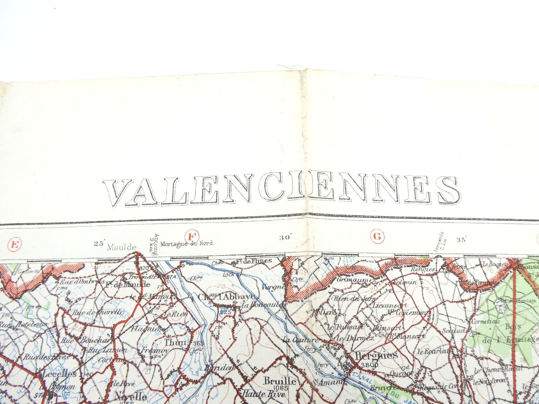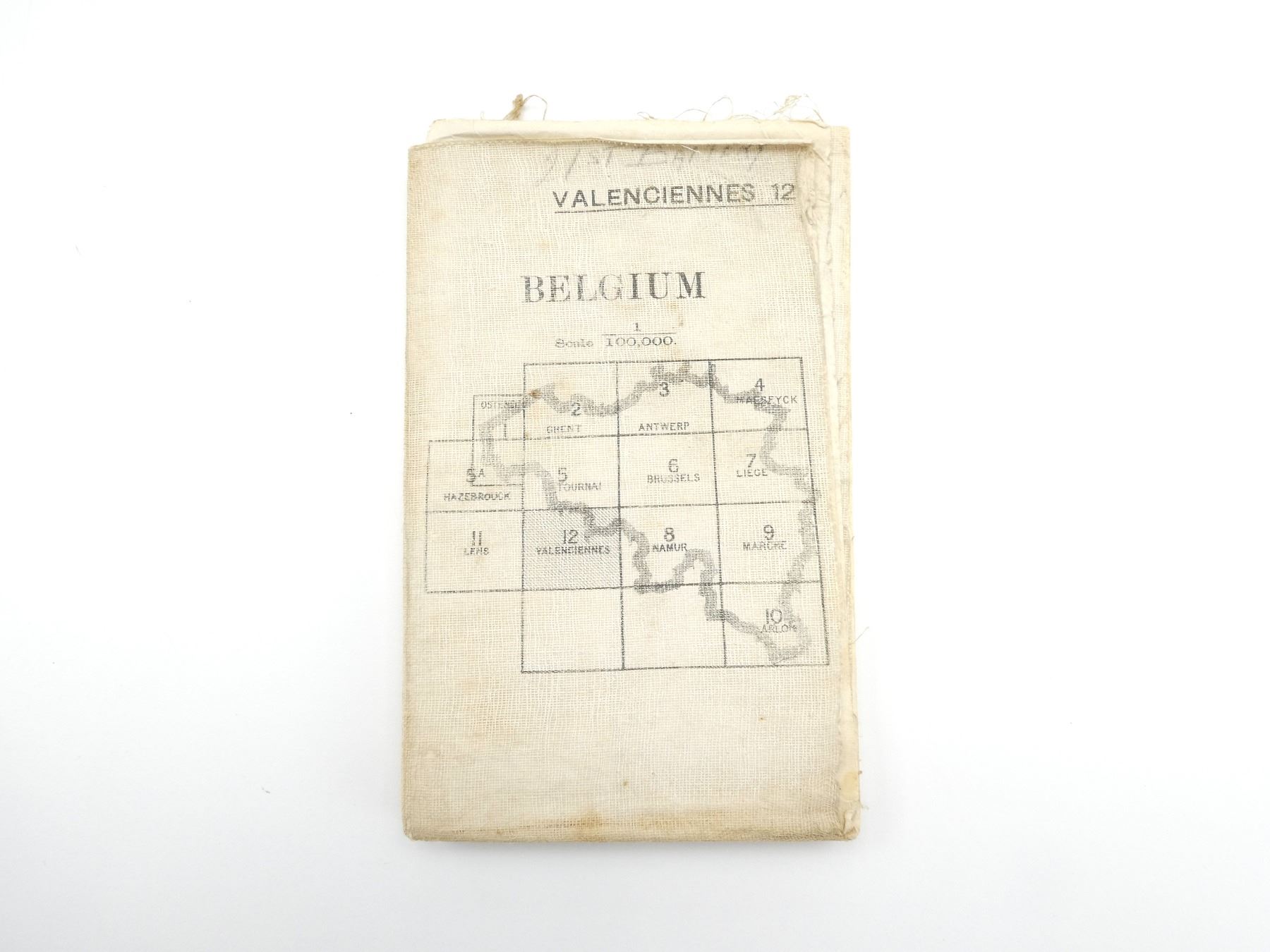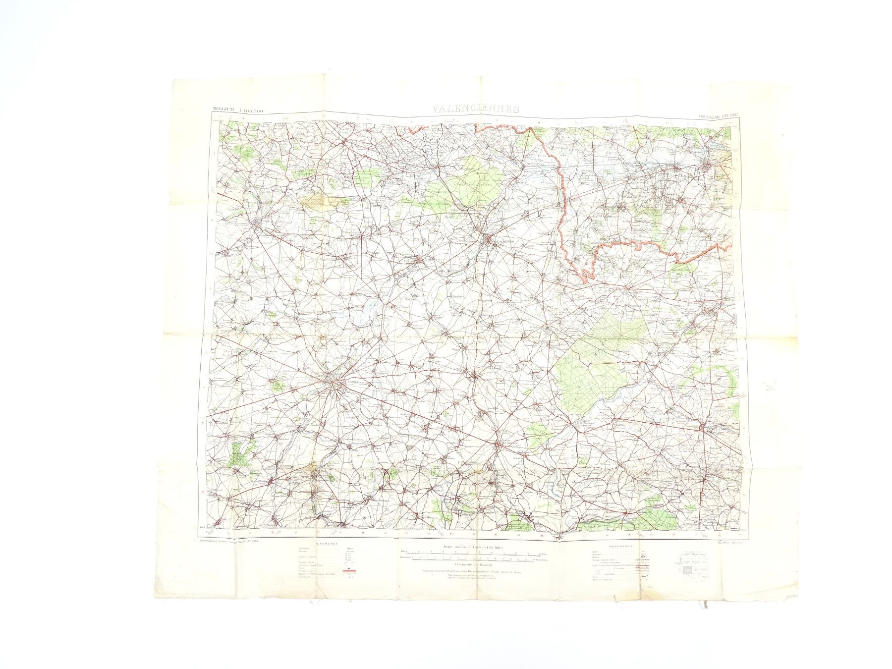 (1) 1915 MAP OF VALENCIENNES, BELGIUM, MARKED: "BELGIUM 1:100, 000, VALENCIENNES" & "GEOGRAPHICAL SECTION, GENERAL STAFF, NO. 2364, WAR OFFICE, MAY 1915" & VARIOUS OTHER MARKINGS, HAND-WRITTEN MARKING: "21ST BATTERY", COLOURED MAP, SCALE 1:100, 000 OR 1" TO 1.58 MILES, APPROX. 33 3/8" X 27.75". SEE PHOTOS.