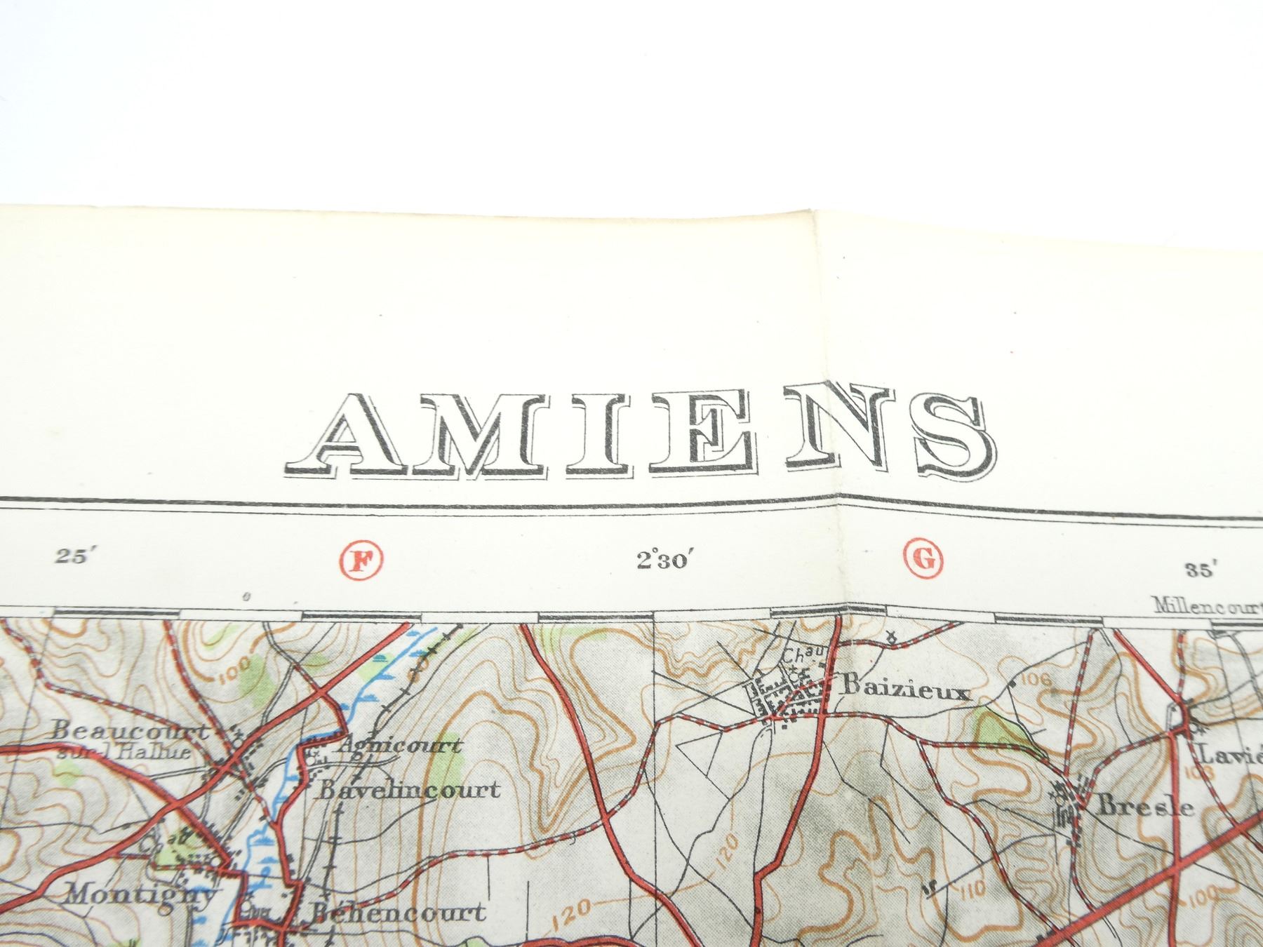 (1) 1915 / 1916 MAP OF AMIENS, FRANCE, MARKED: "FRANCE 1:100,000, AMIENS, EDITION 2" & "GEOGRAPHICAL SECTION, GENERAL STAFF, NO. 2364, WAR OFFICE, OCTOBER 1915, ORDNANCE SURVEY 1916" & VARIOUS OTHER MARKINGS, COLOURED MAP, SCALE 1:100, 000 OR 1" TO 1.58 MILES, APPROX. 33 5/8" X 28". SEE PHOTOS.