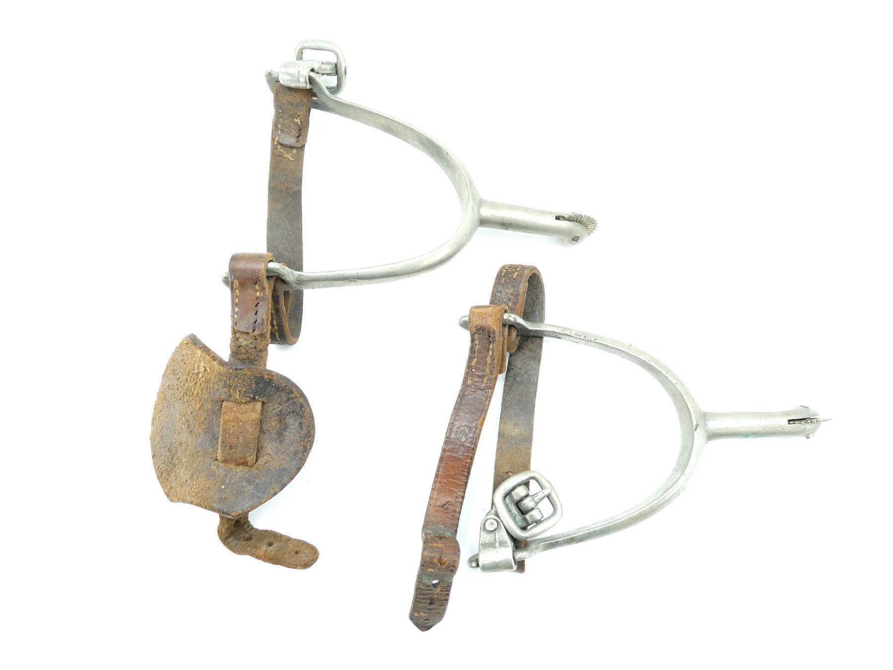 (1) PAIR OF BOOT SPURS, METAL SPURS WITH LEATHER STRAPS, METAL MARKED: "SKINNER CO., 1916" WITH C-BROAD ARROWS, LEATHER STRAPS / TABS MARKED: C-BROAD ARROW OVER "10", ONE MISSING LEATHER TAB, LEATHER STILL FAIRLY SOFT, SHOWS WEAR / TEAR, APPROX. 4" L X 4" W, OAL APPROX. 6.5". SEE PHOTOS.