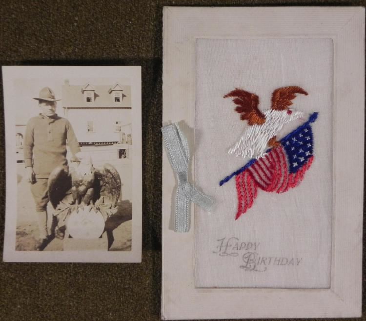 OFFERED HERE IS A WWI DOUGHBOY PHOTO & A GREAT EMBROIDERED BIRTHDAY CARD SENT TO HIS WIFE. THE CARD WAS EMBROIDERED ON MATERIAL WITH EAGLE & US FLAG-SOLDIER POSES BY EAGLE STATUE.