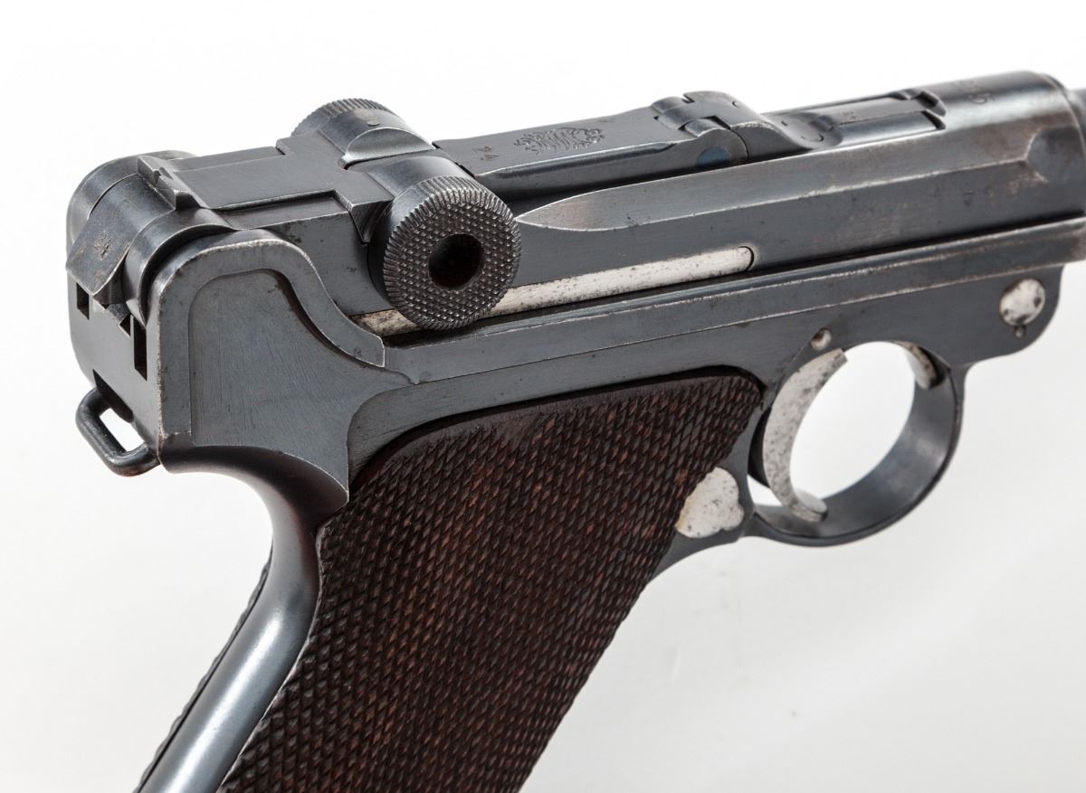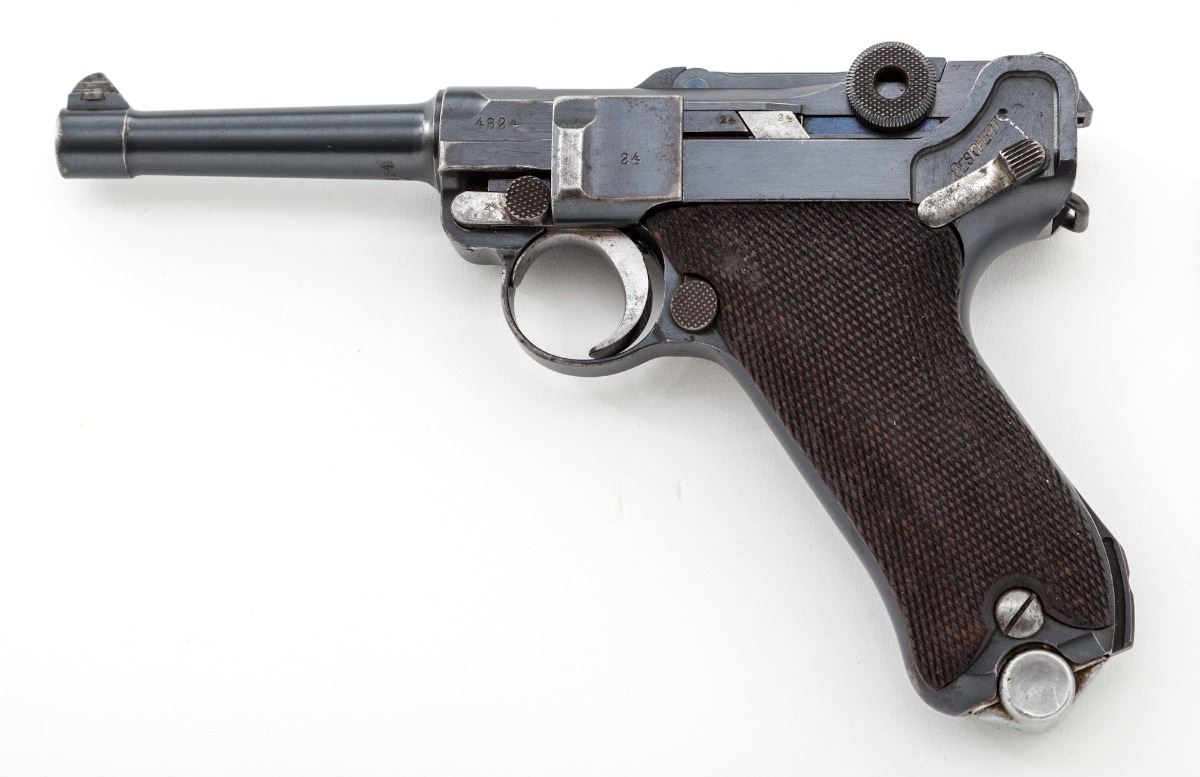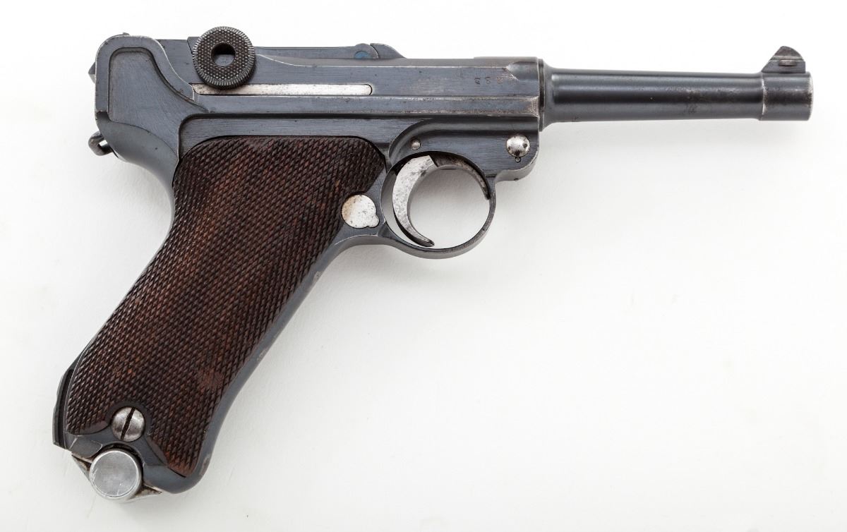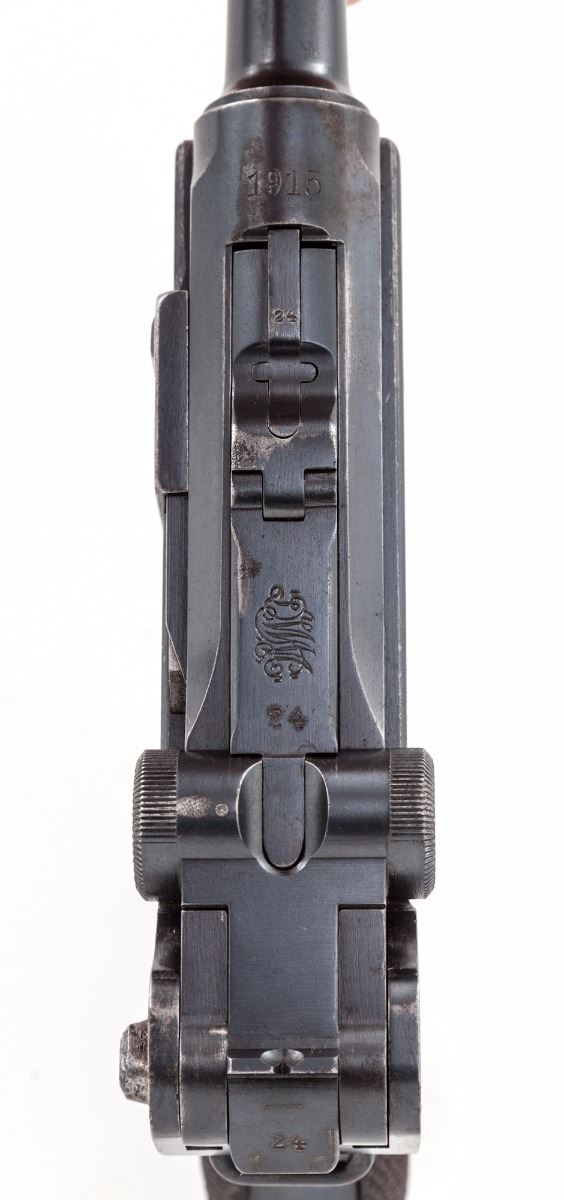 WWI Era DWM Model 1914 Luger, #4824h, 9mm, 4'' barrel, blue finish, straw small parts, checkered walnut grips, with all appropriate acceptance and firing proofmarks on right side barrel extension, which are lightly stamped, but do not appear to be re-done; barrel and breech firing proofs are strong. Chamber date is 1915. All matching numbers including firing pin; grips appear to be the appropriate type but are replacements being marked ''80''. Magazine is a later aluminum base model marked 7679. Condition is very good retaining approx. 85% original rust blue with small areas of minor holster wear, with a few spots of pitting and thinning blue. Straw colored parts have faded to bright with age spots and normal wear. Replacement grips show minor flattening to the checkers. Action functions as designed, bore is excellent. Est.: $1,500-$2,200. (C&R/PPT)