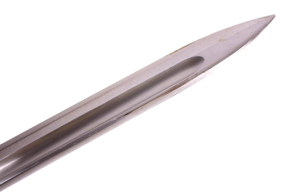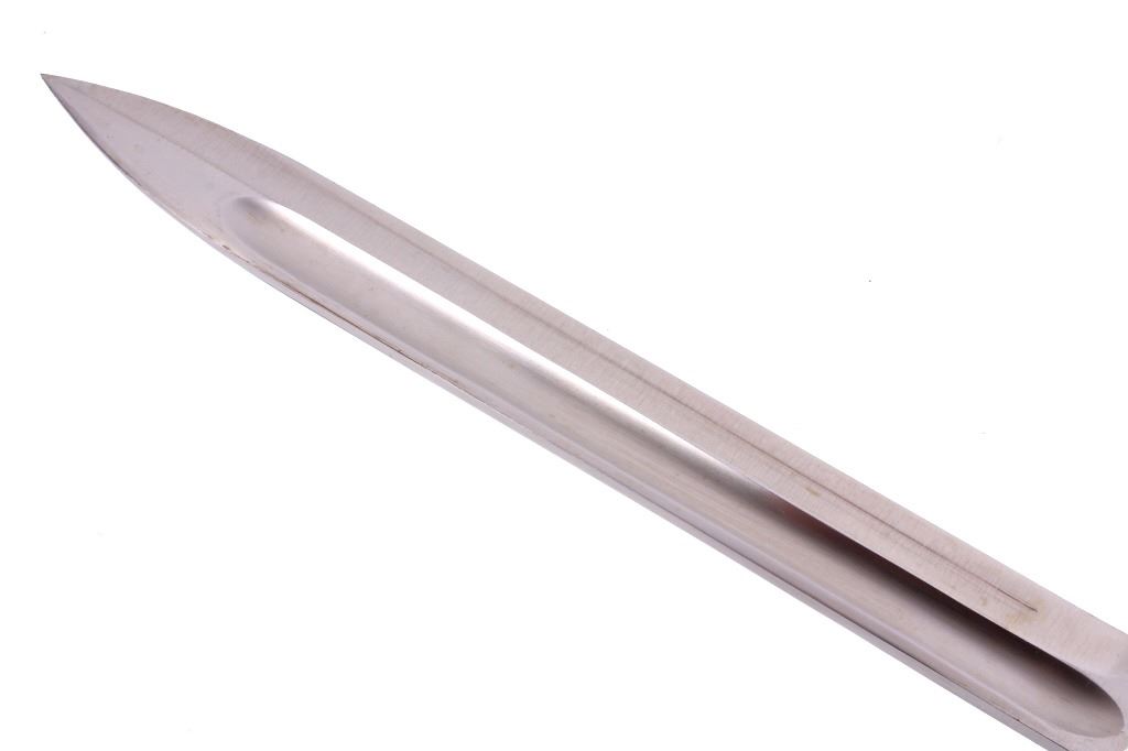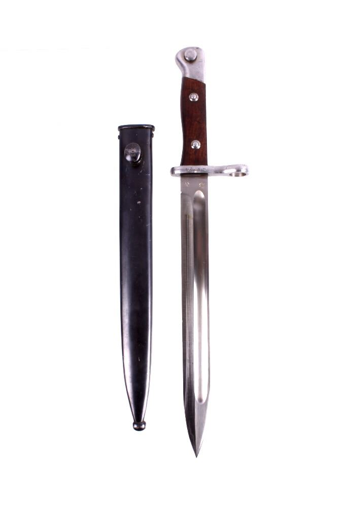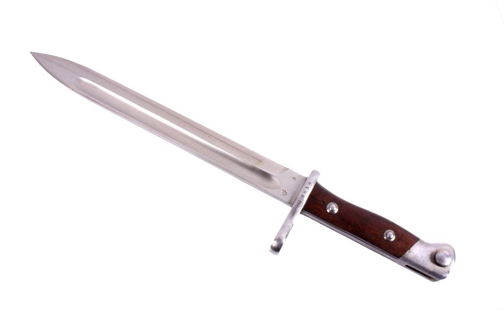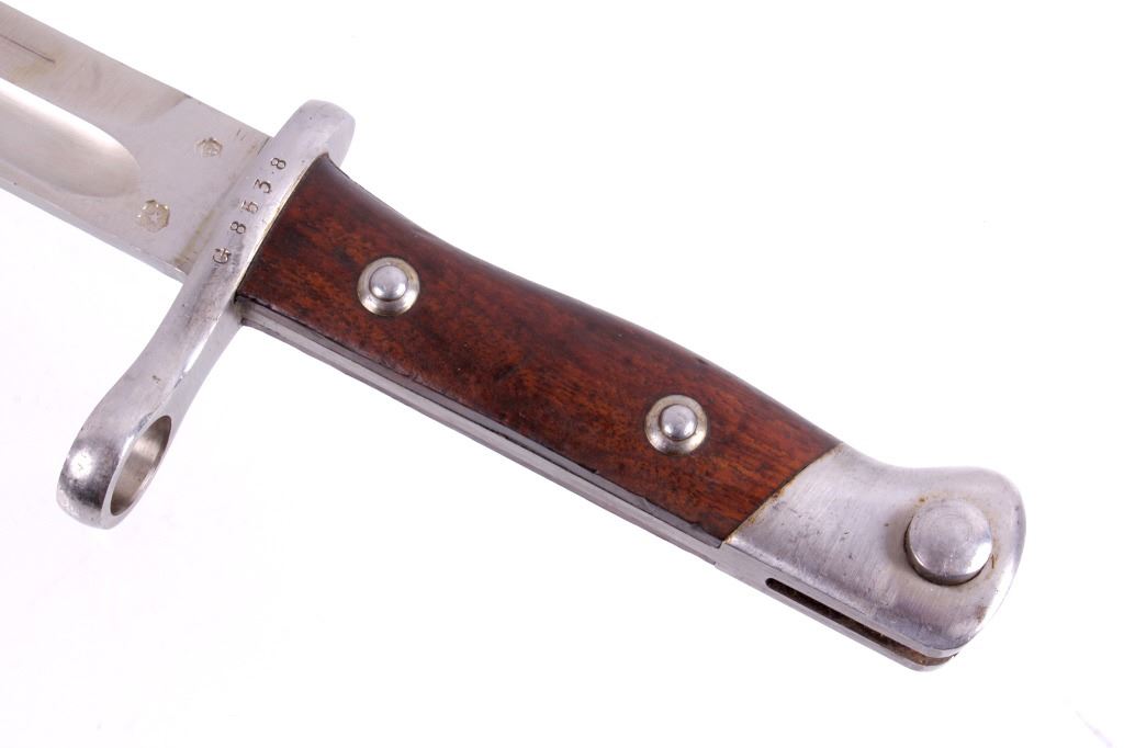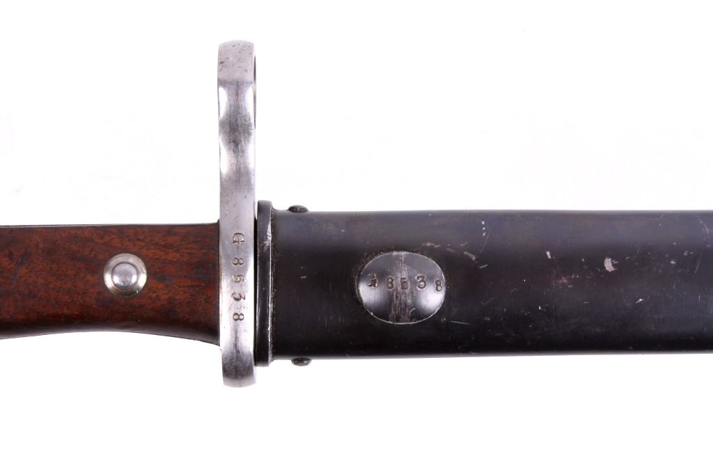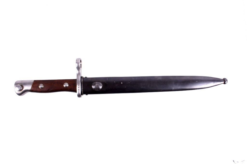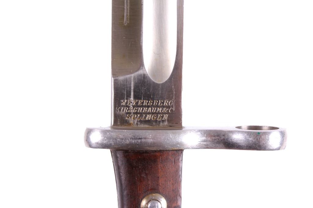 For your consideration is this WWI era, imported Chilean Mauser rifle bayonet, circa 1895. The bayonet is marked above the hilt “Weyersberg Kirschbaum & Co. Solingen” and shows the Chilean import seal on the other side with a serial number of 'G8538.' The condition of this bayonet is good, with no obvious signs of damage. The measurements of this bayonet are 15 1/2" x 3" with a blade length of 10".