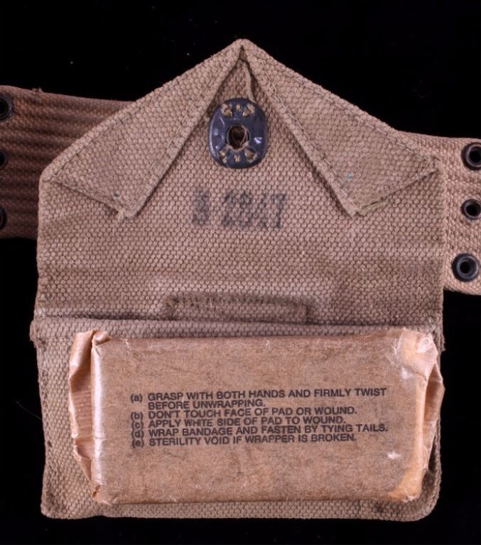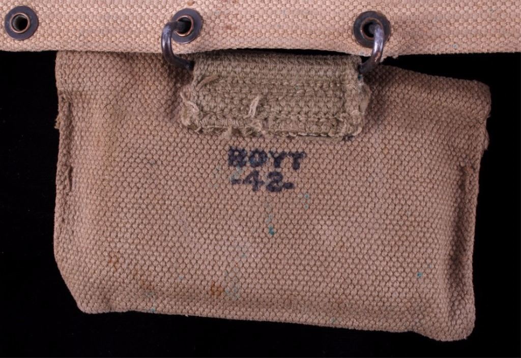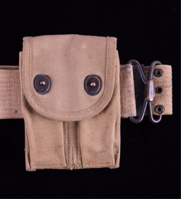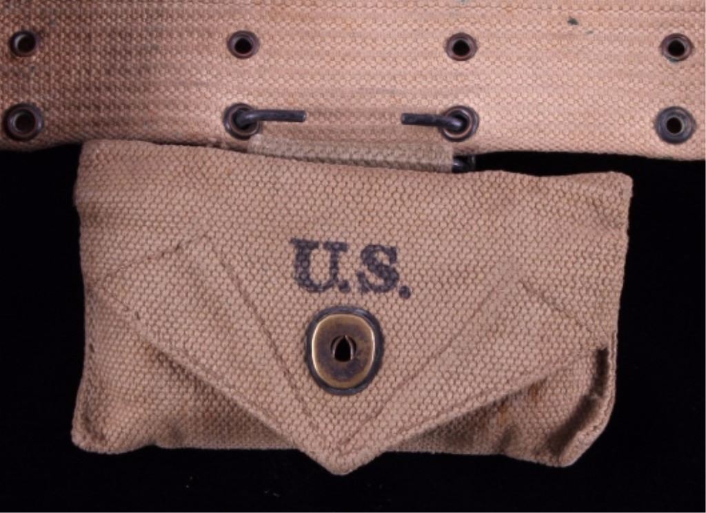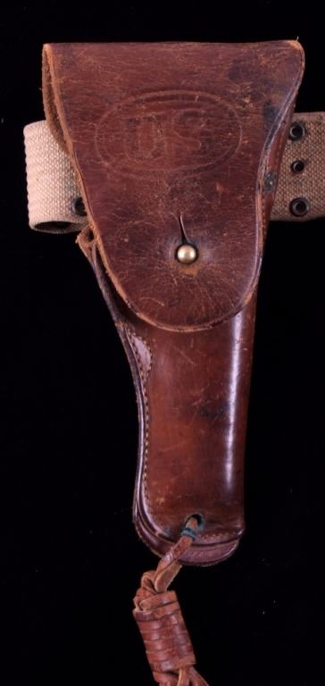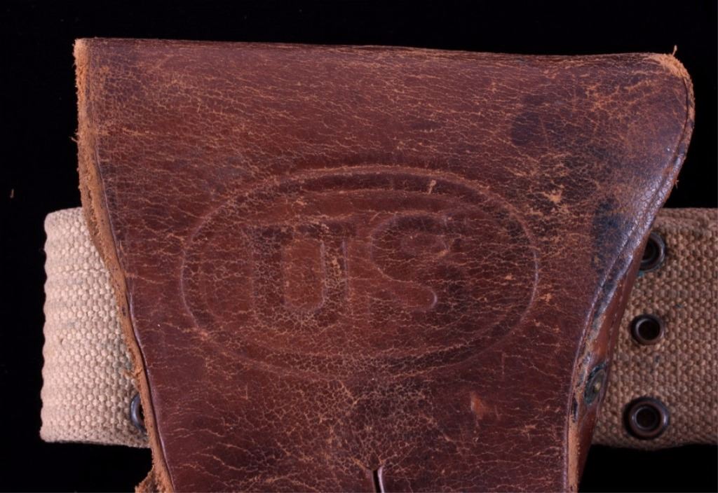 This is a U.S. Army M1911 pistol holstyer and belt. Included with the holster is a M1911 magazine pouch and a field dressing and pouch. The holster appears to be marked "Boyt LMS" on the back. The field dressing pouch is marked "U.S.". The magazine pouch is marked "F.S.F. 991 8 1918". The holster, pouches and belt are all in good condition. The belt measures 40" long.