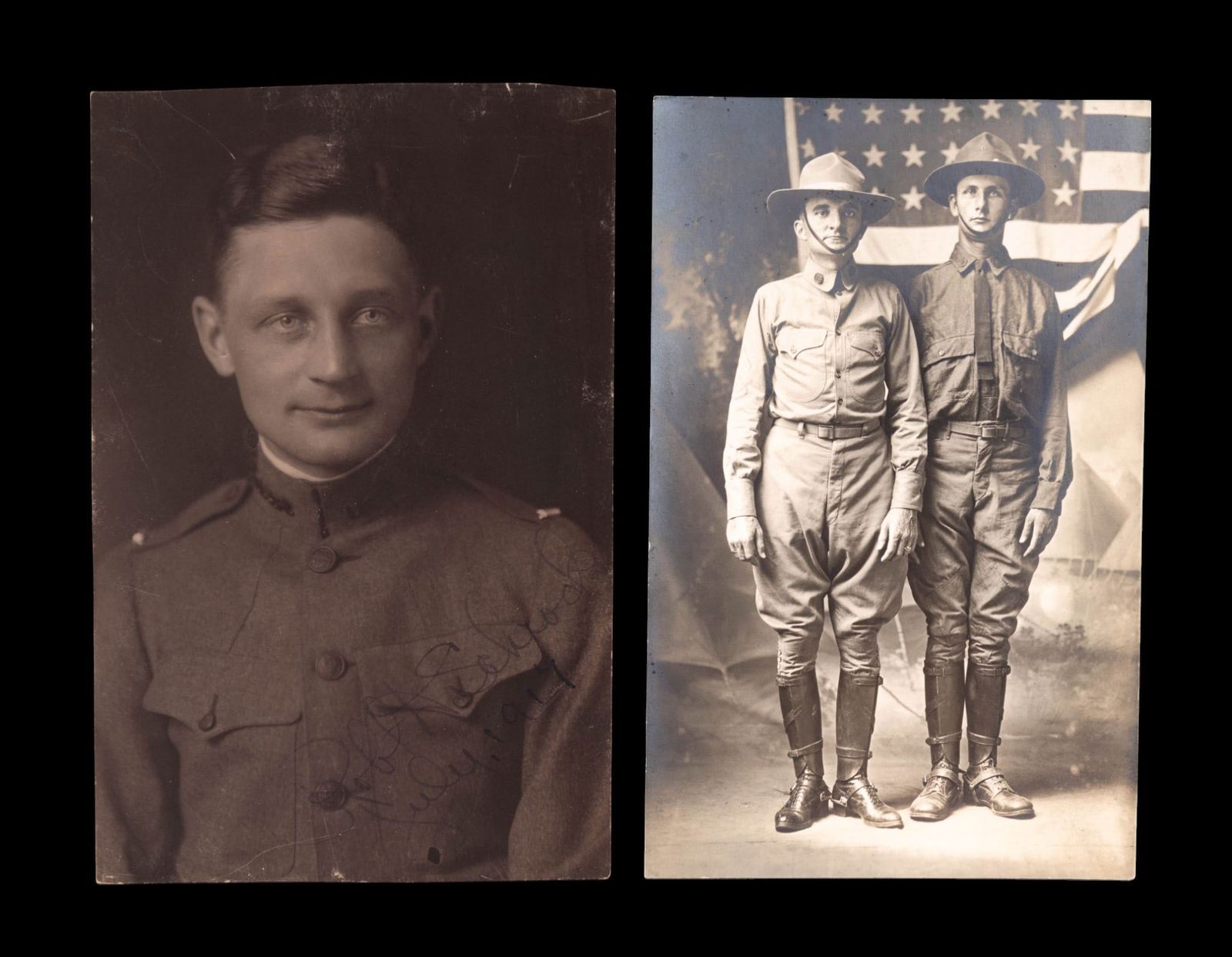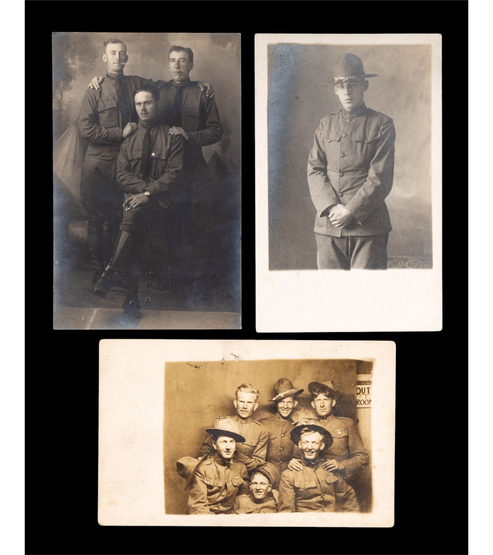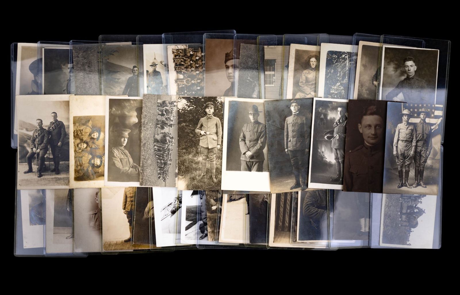 Collection of WWI era United States Military black & white photographs & photograph post cards, including portraits of soldiers in uniform, group photographs, & training photographs. Some post cards are signed and/or have notes written on the back. There are 41 total photographs. See photos for further details.