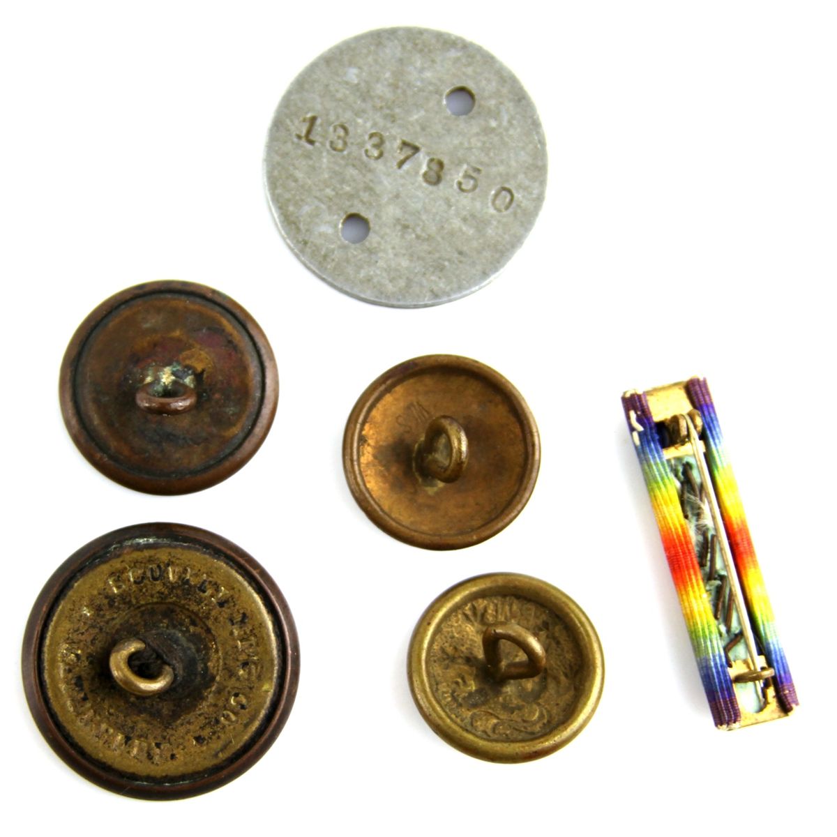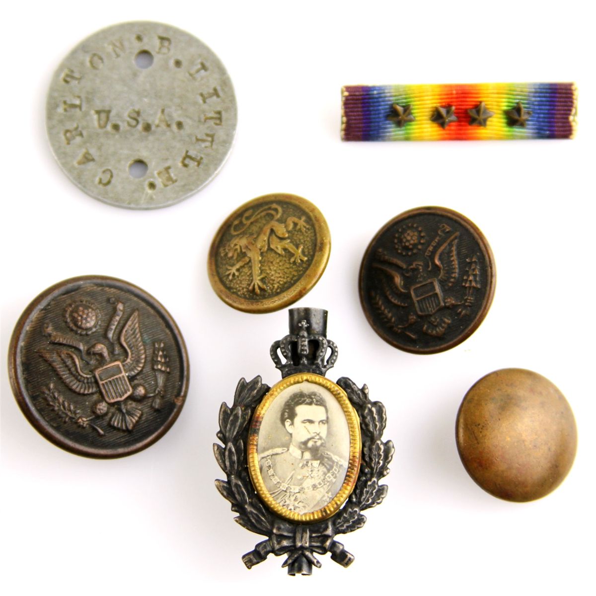 Small WWI archive of Carlton B. Little including a 1.5" silver pin with a celluloid photo of Archduke Franz Ferdinand, dog tag, 4 buttons, and a bar.