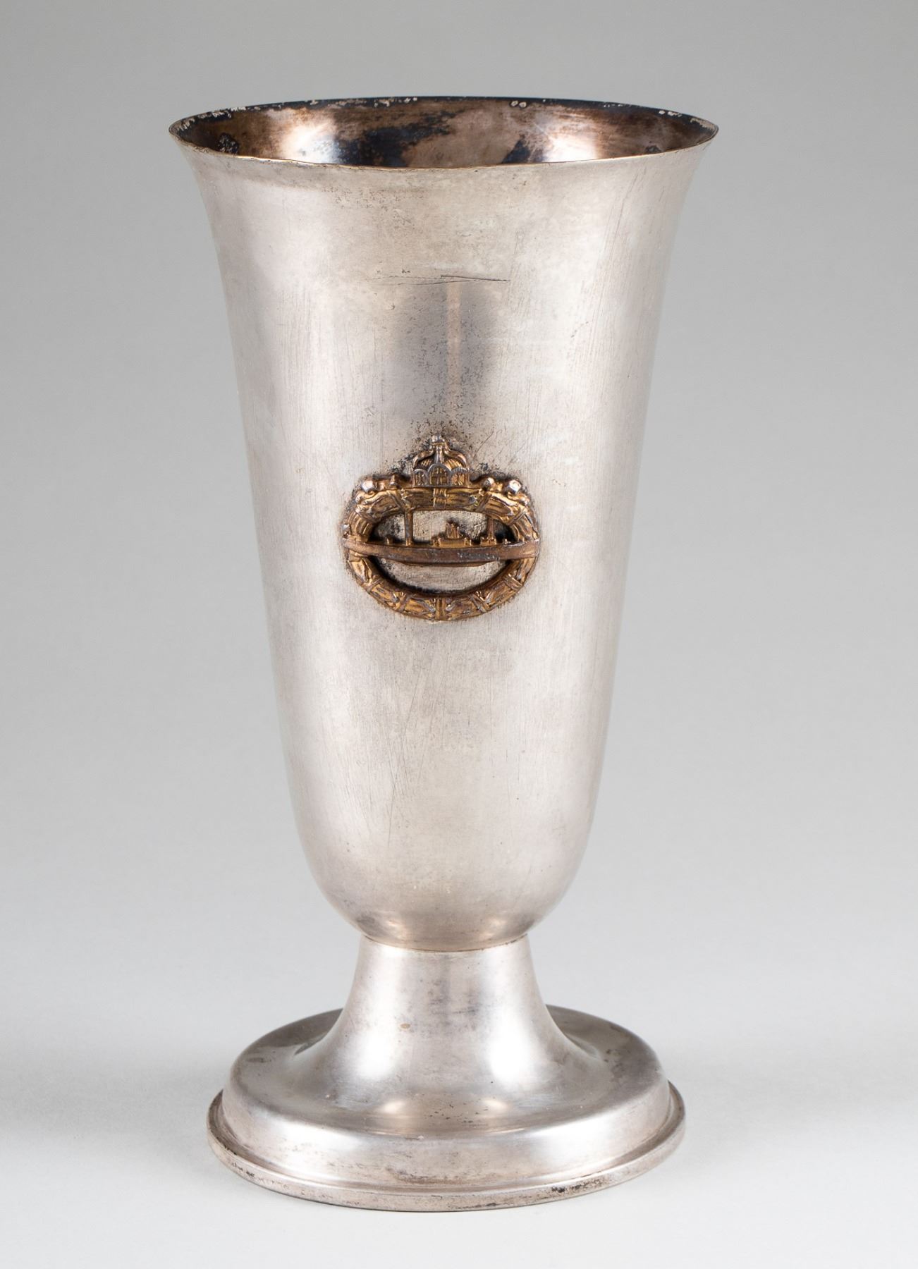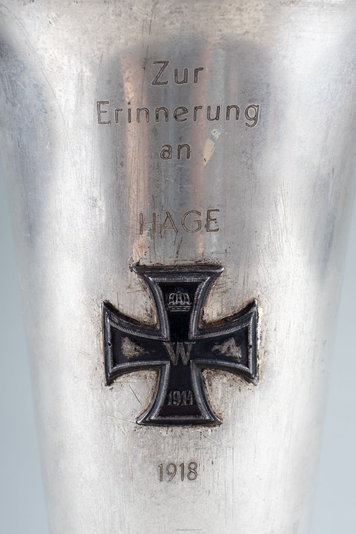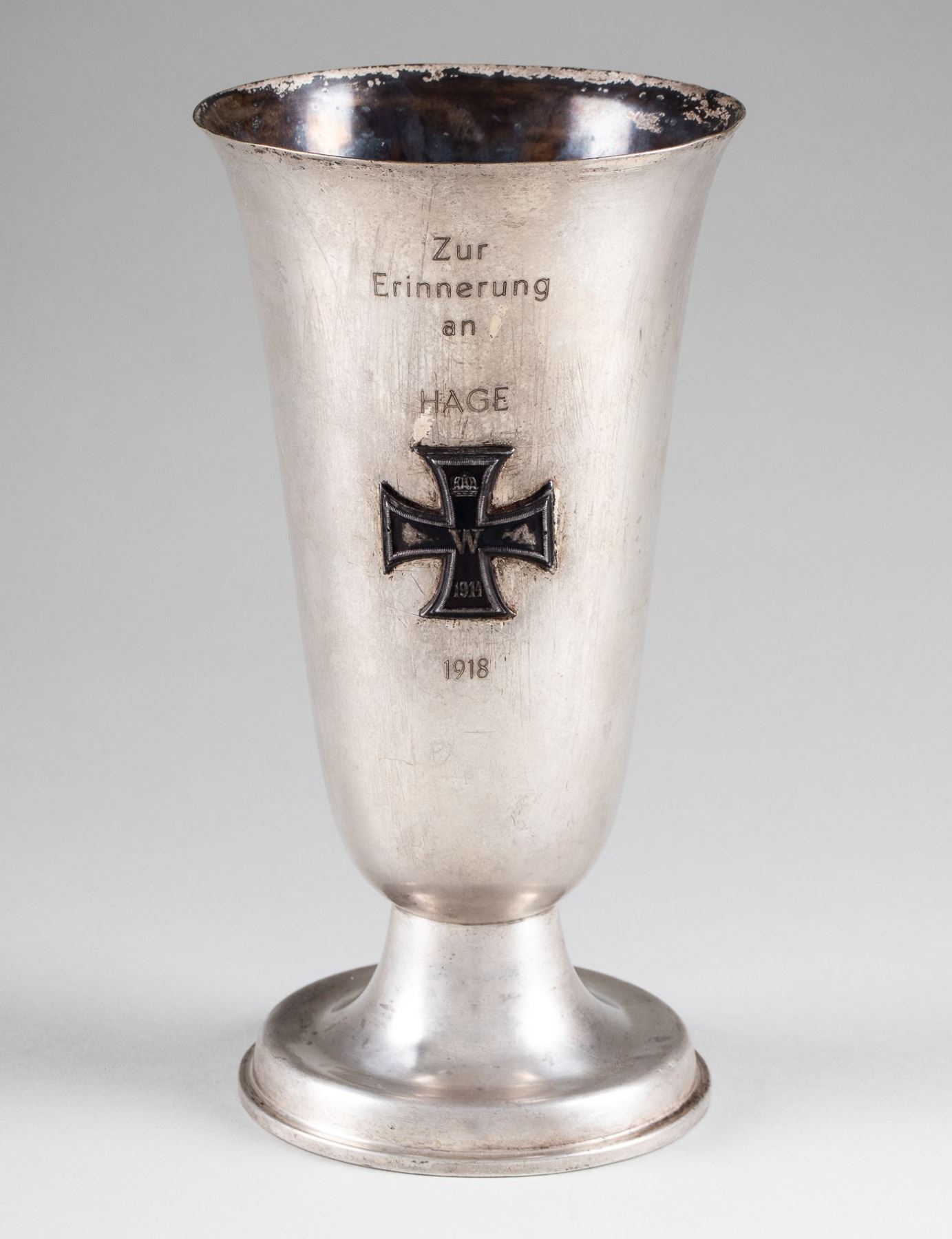 German WWI commemorative globlet in memory of Hage 1918. The goblet is engraved 'In memory of Hage 1918' and a WWI Iron Cross has benn affixed. A WWI German Imperial U-Boat badge is applied to the opposite side. the goblet is made of German silver or Alpaca, 10 inches tall and 5.25 inches in diameter at the top. Hage is a small East Friesian town in Lower Saxony, Germany. In 1914 the Imperial German Navy used the strategic location to establish an airship port. In the first years of the war, Hage was one of the bases for German military airships on the North Sea to bomb targets in Great Britain.