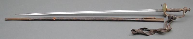 -with etched single-edged blade, brass hilt with wire-bound grip. In brass mounted leather scabbard.