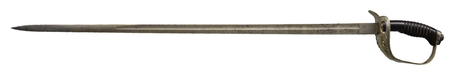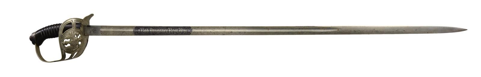 Overall length: 40 3/4". Blade length: 34 3/4". Single fullered blade is etched over 1/3 of its length with various foliate, patriotic and military motifs including a darkened panel that reads, "2. Bad. Dragoner Regt. No21.". Ricasso is stamped with crossed sabers and illegible letters. 3 Branch, semi-basket, steel hilt has a crowned Prussian eagle in the guard. Plain pommel cap with composite grip. No scabbard. CONDITION: blade has a light gray patina with scattered dark spots. Hilt is a bit loose and has some pealing to the finish, particularly at the pommel. Grip has a large broken area extending up 2" from the ricasso. (02-17721/BF). $200-300.