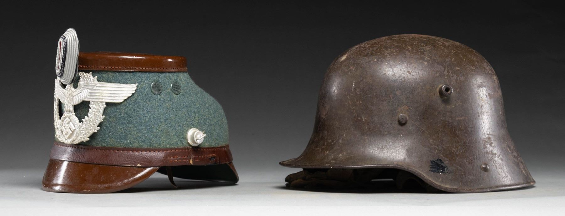 WWI GERMAN HELMET & WWII GERMAN POLICE SHAKO.