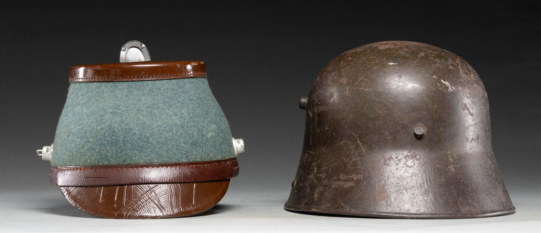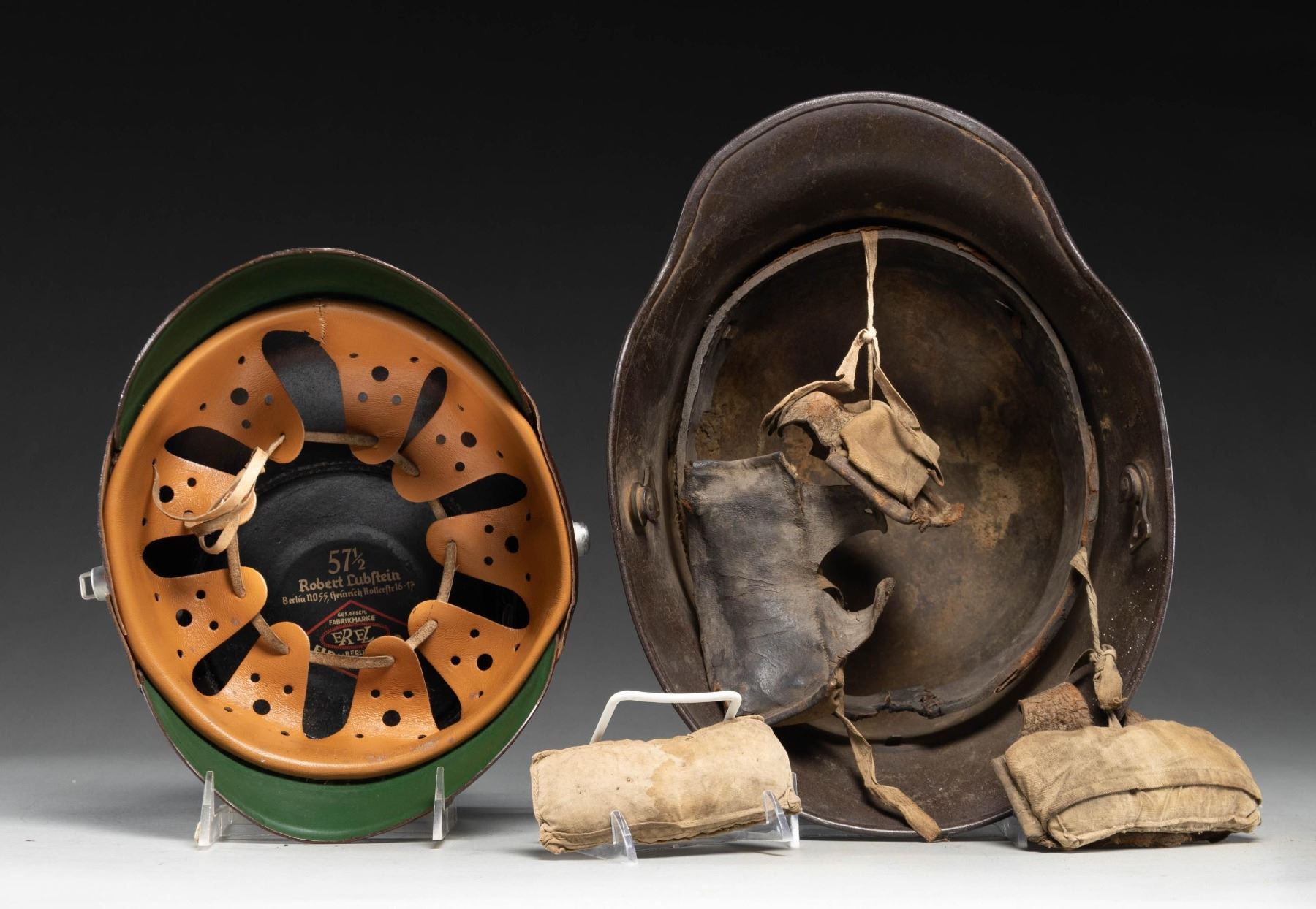 1) HELMET. A good German M1916-17 helmet with a dark field green/gray painted finish, The inside left of the helmet is stamped "ET.66". A partial three-pad liner is present and all three rivets are present. No chinstrap. CONDITION: the helmet retains most of its original finish. The liner is mostly there but detached in spots. All three pads are there but loose. 2) SHAKO. A nice example of a green felt Police shako woth brown leather trim. No chinstrap. Large aluminum Police eagle on the front with cockade above. The interior is marked "57 1/2 Robert Lubsstine Berlin NO 55 Heinrich Rollerstr 16-17 GES. GESCH. FABRIKMARKE EREL FIBER TSCHAKO BERLIN". CONDITION: light wear overall. (02-24441-3/BF). $500-800.