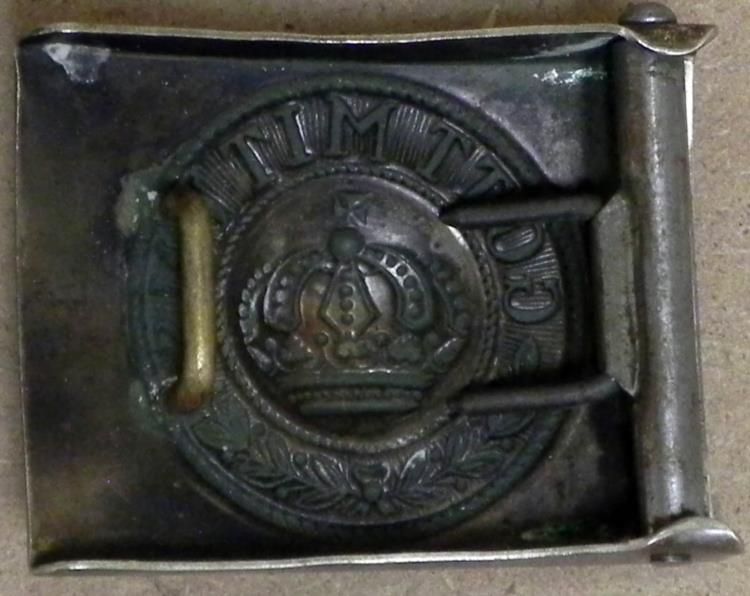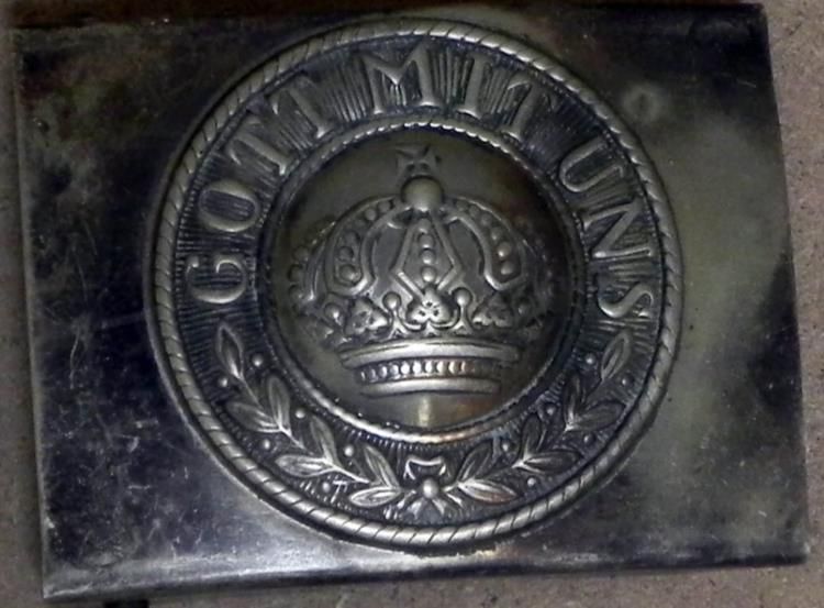HERE IS AN ORIGINAL WWI GERMAN IMPERIAL ARMY BELT BUCKLE. IT HAS A NICE PATINATION, WITH THE WORDS "GOTT MIT UNS" AND A CROWN IN THE CENTER.