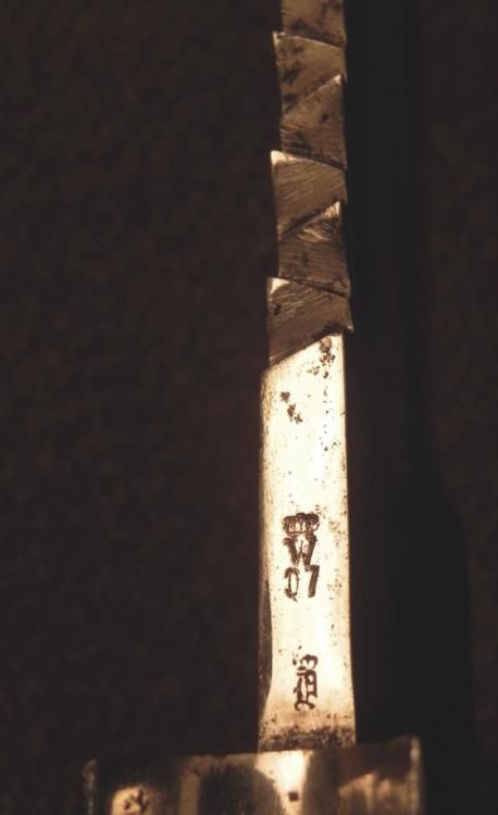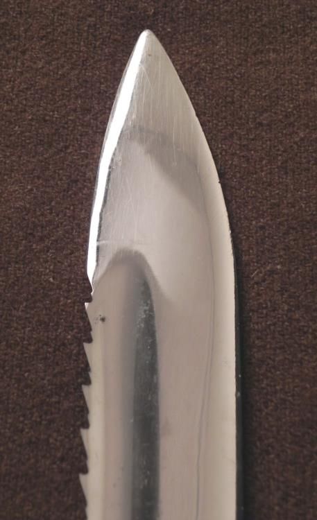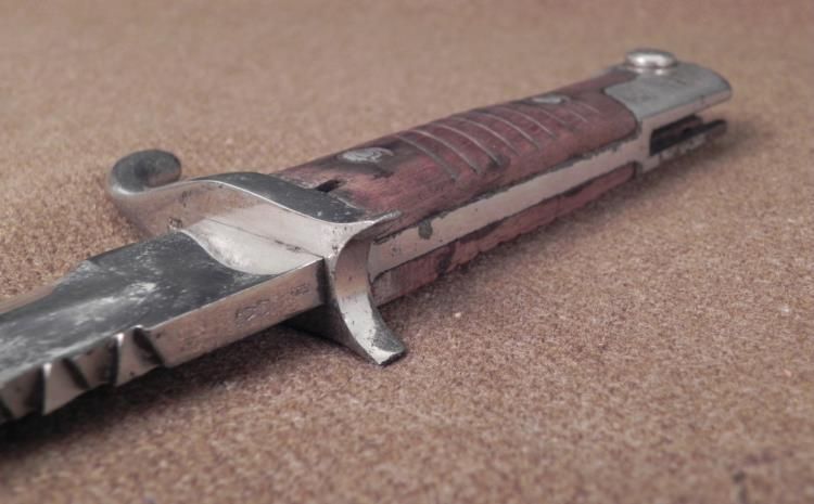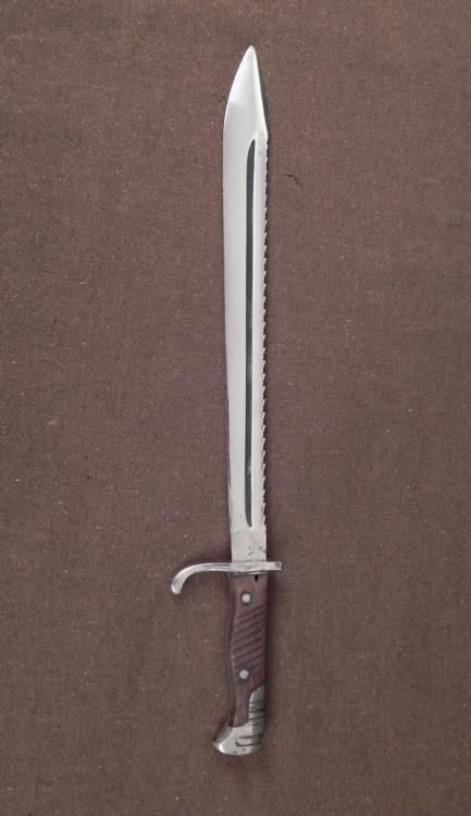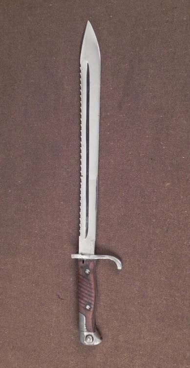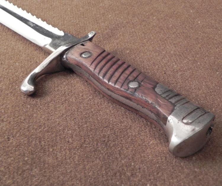 WWI GERMAN K98 SAW-TOOTH BUTCHER BAYONET-MARKED & 1907- * * "DANGEROUS LOOKING ORIGINAL PRE-WWI GERMAN MAUSER 98K/K98 LONG, WIDE "BUTCHER" BAYONET WITH SAW TOOTH JAGGED EDGE--NICE WOOD GRIP-RELEASE BUTTON WORKS FINE--BRIGHT BLADE--O/A LENGTH 19 3/4".-SCARCE EDGED WEAPON-SIDE MARKED WITH IMPERIAL CYPHERS AND DATED "07" 1907 *