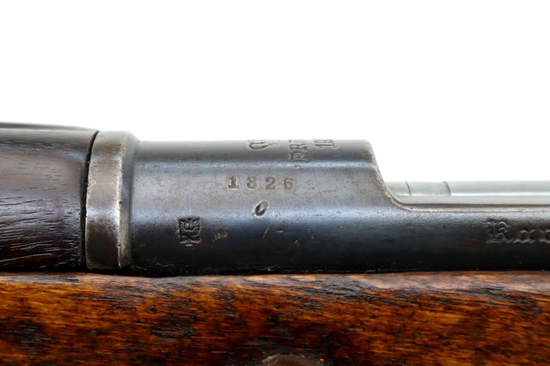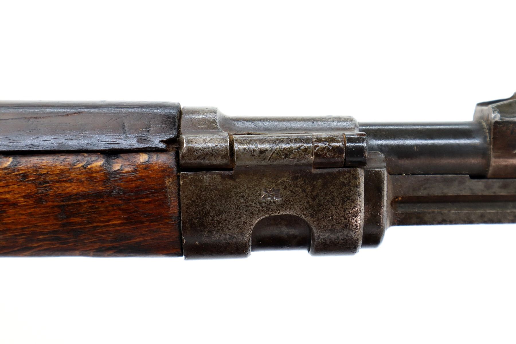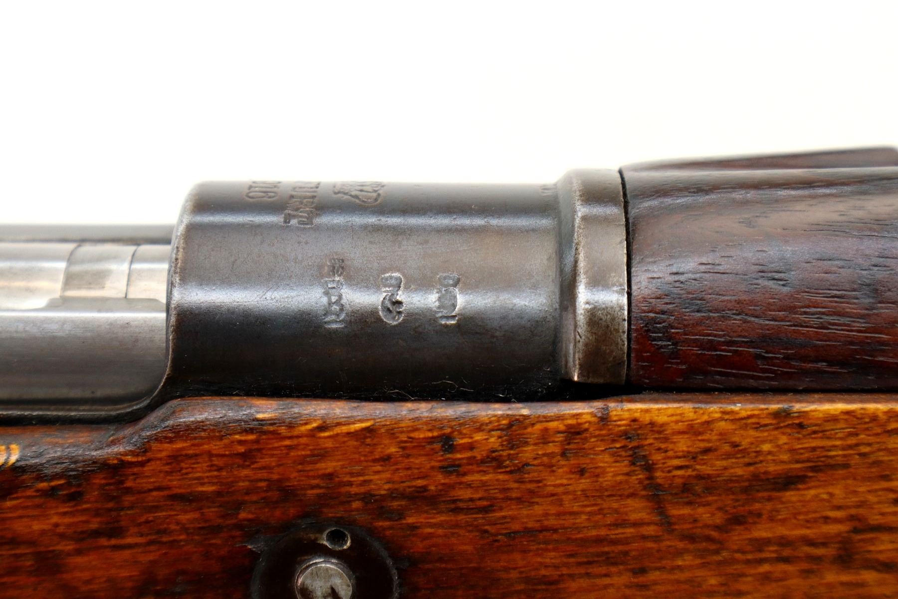Main Description: Manufactured by Erfurt 1916, bolt matches other parts do not. Barley corn front sight with ramp ears have been removed, u notched rear sight, blued finish, turned down bolt handle with checkered flat bottomed knob. Two piece full military wood stocks, pistol grip, chipped and cracked behind receiver, smooth steel butt plate, steel stock disk, replaced trigger guard and floor plate, sling swivels, bayonet lug.