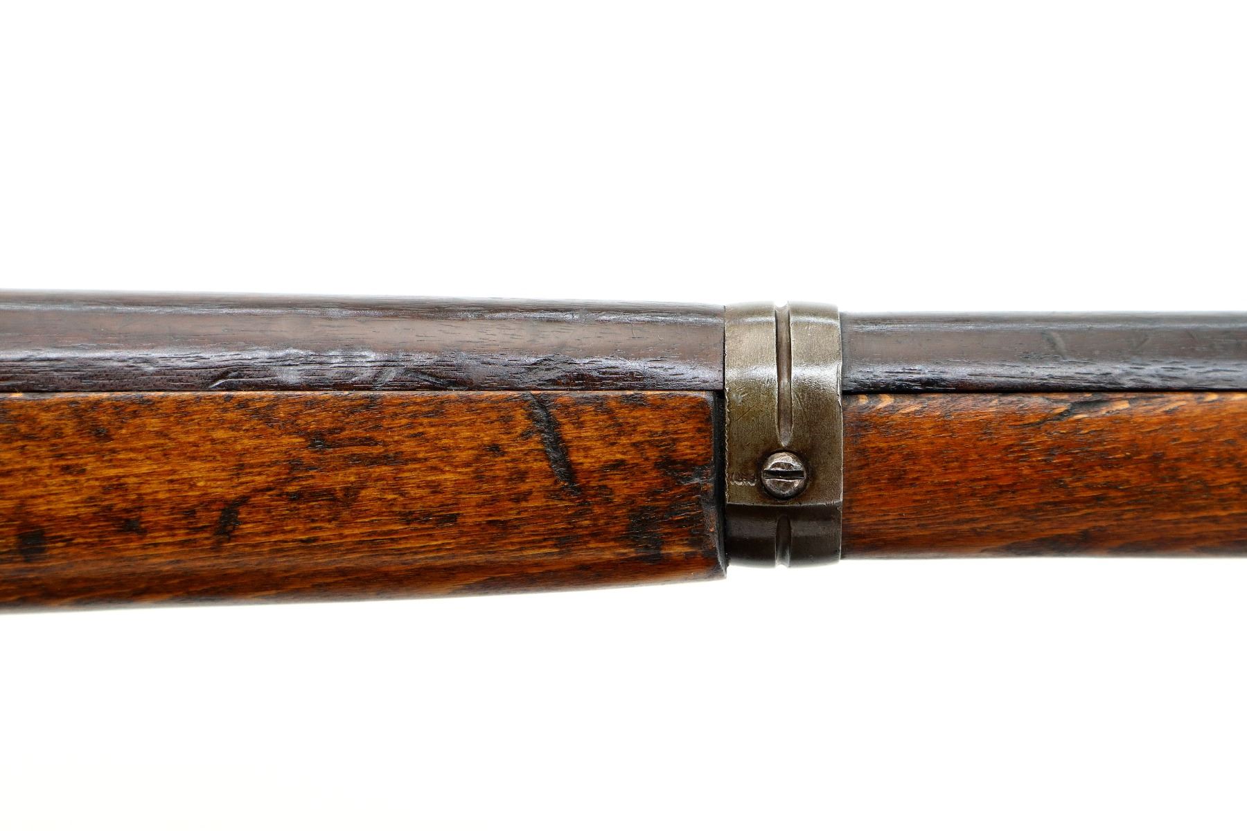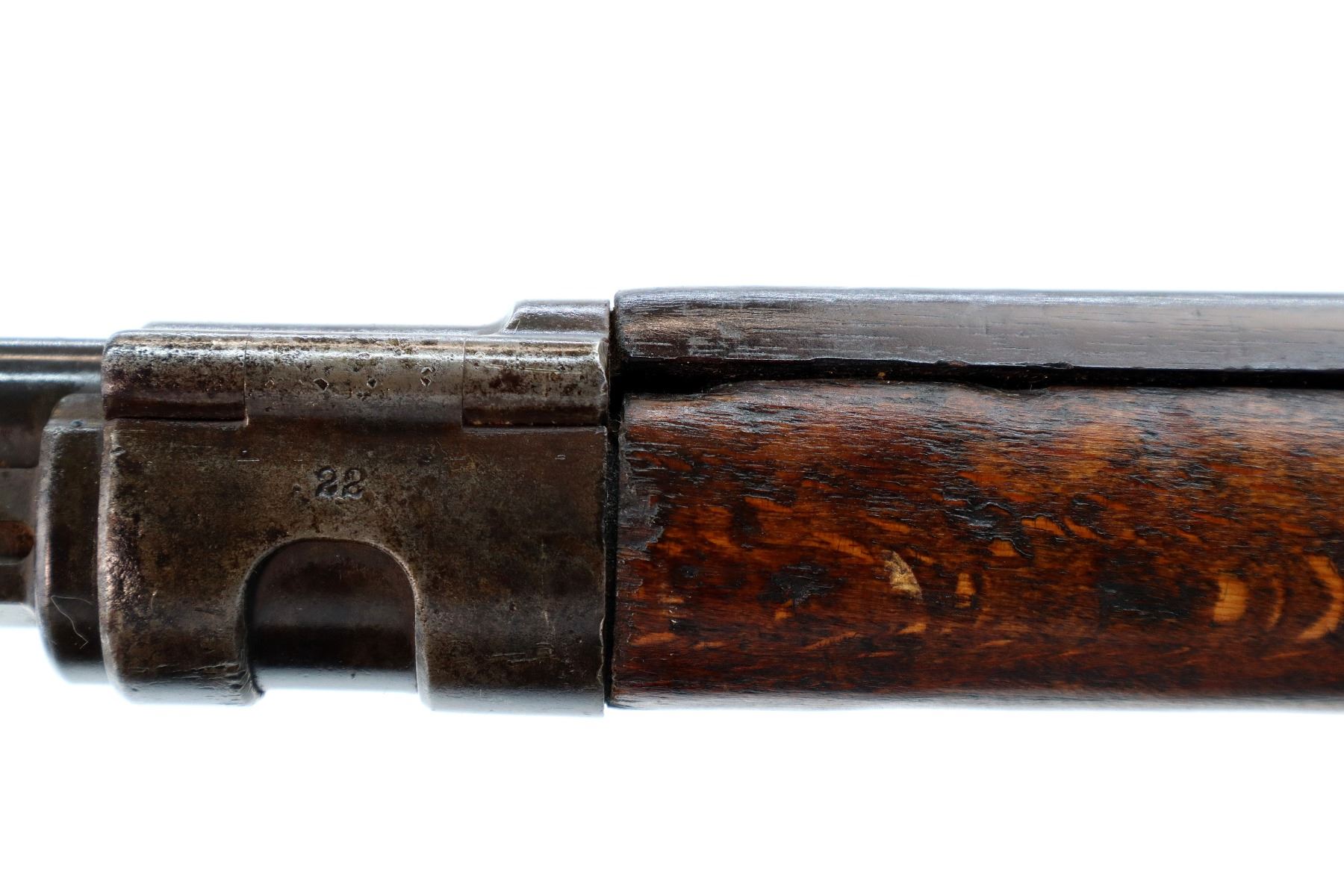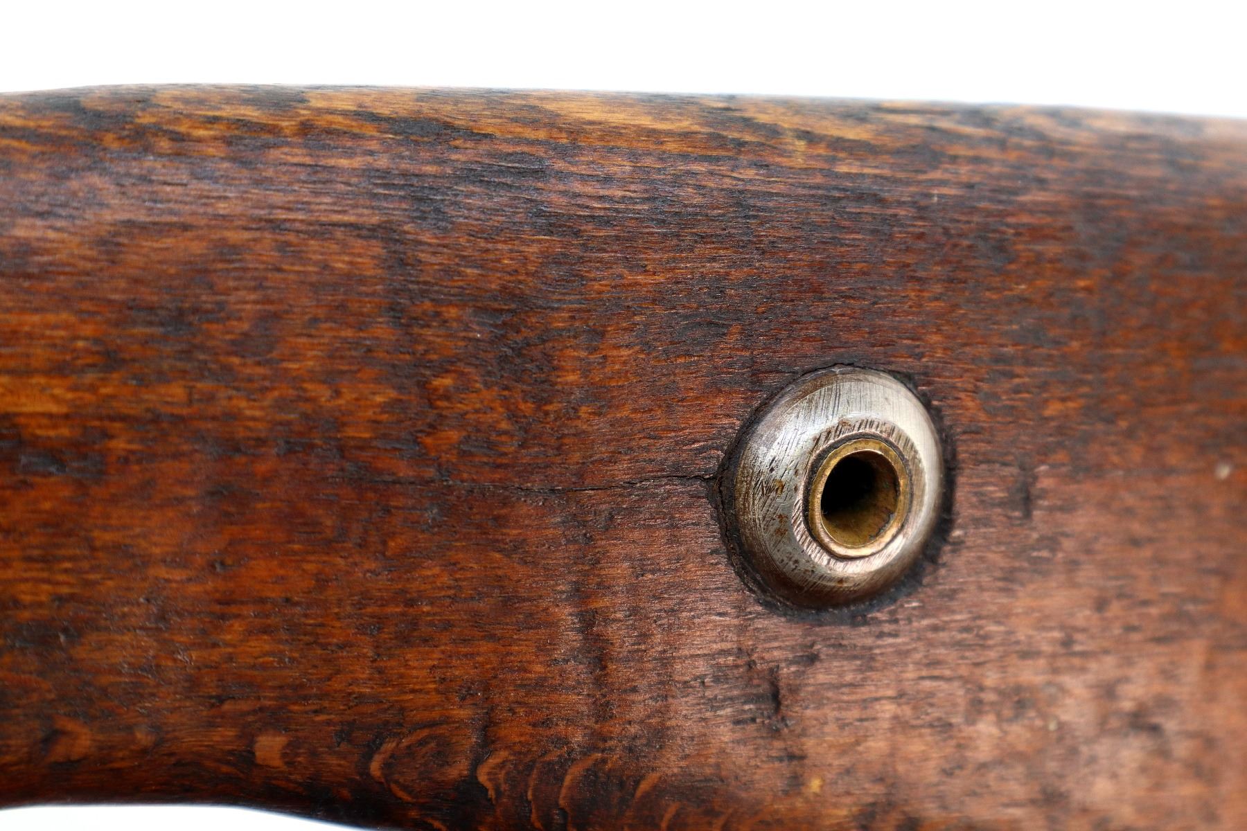 Main Description: Manufactured by Erfurt 1916, bolt matches other parts do not. Barley corn front sight with ramp ears have been removed, u notched rear sight, blued finish, turned down bolt handle with checkered flat bottomed knob. Two piece full military wood stocks, pistol grip, chipped and cracked behind receiver, smooth steel butt plate, steel stock disk, replaced trigger guard and floor plate, sling swivels, bayonet lug.