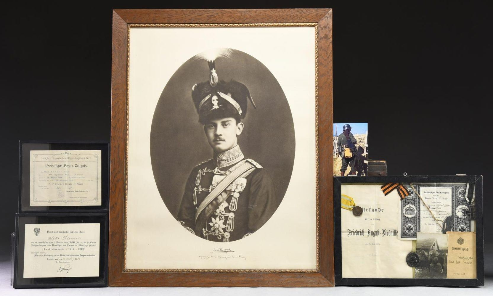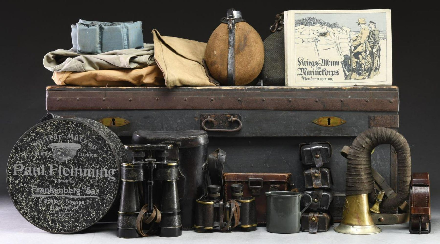 1) Majority of lot is contained in 36" x 18" x 15", & is marked on the lid "MAJOR R. H. FITZROY / R.G.A.". Consignor supplied notes detailing service in Royal Garrison Artillery as 2nd Lieutenant on Sept. 3, 1902, 1st Lieutenant on Sept. 3, 1905 through 1912 w/ 43rd Company, Cork Harbor, Ireland. 2) Photo measuring 32" x 25" of a soldier appearing in Lieutenant Colonel in Hussar uniform. Script appears to translate to "Ernst August / Duchy of Braunschweig-Luneberg". 3) Trunk containing WWI German militaria includes, but is not limited to, a certificate appearing to translate to "Royal Bavarian Jaeger Regiment No. 1 death certificate confirming KIA Nov. 26, 1916", 2 pairs of binoculars, 1915-dated bugle, richer box containing paperwork, Iron Cross, pictures, & other medals, Paul Flemming box for cap, 4 books in German, Kaiserlich Marine photos, bread bag, blue-colored ammo bandolier, brown leather shoulder bandolier, & 2 canteens. CONDITION: items appear in good overall condition showing wear & staining. PROVENANCE: from the Lifelong Collection of Glen E. Mattox. (02-18957/MD). $500-700.