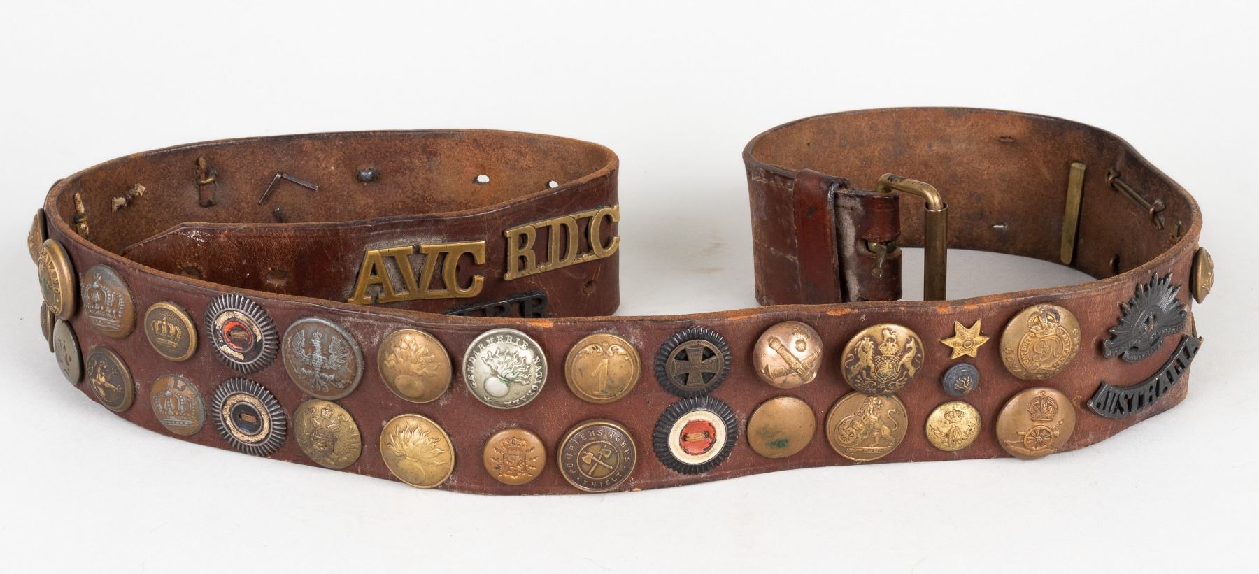 Large WWI German soldier's souvenir 'hate' belt with 50 pins from Allied soldiers. Attached to the leather belt are German, British, Australian, French, Kiwi, and American insignias and buttons in two rows. The leather belt is approx 45 in. long and 3 in. wide.