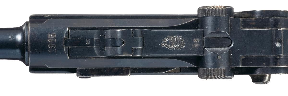 This is a fine example of a mid-WWI German luger pistol as produced by the DWM factory in 1915. It is the standard four inch barrel model that was used during WWI, the Weimar era and throughout WWII. The top of the chamber area is dated 1915 and the front toggle has the DWM factory logo. The right side of the barrel extension is marked with three "crown/script letter" proofs along with the Imperial eagle proof. The top of the barrel has the single Imperial Eagle as used on DWM lugers and the underside has the serial number and bore diameter, "8,82". It is correctly serial numbered in the military style with the full serial number on the left side of the barrel extension, the under side of the barrel and the front of the frame. The various small parts are correctly numbered with the last two digits (45) of the serial number. The extractor and safety are correctly marked "GELADEN" and "GESICHERT" respectively. It is fitted with a set of original checkered walnut grips. These WWI lugers all have a rust blued metal finish with straw colors on the takedown lever, trigger, safety lever and ejector. It is complete with two non-matching wood base, nickel plated magazines, and a brown leather holster. The holster has an unreadable makers name inside the flap over 1915.