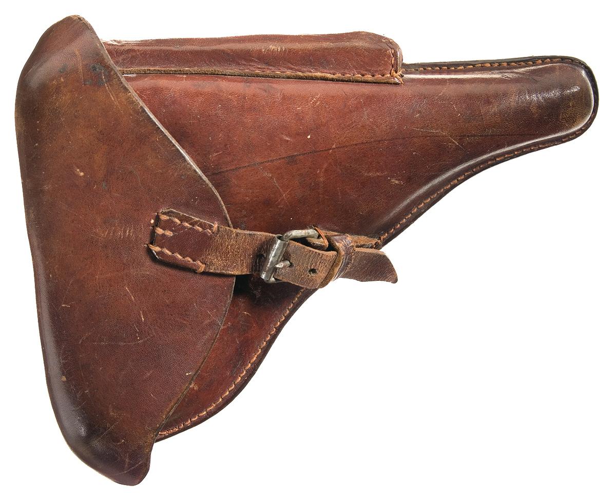 Condition: Very fine with 90% of the original blued finish overall, showing wear and blue loss on all the edges and high spots, such as the frame rails, the side plate hump, the muzzle area with some thinning on the grips. The left side of the frame behind the side plate has a small patch of pin prick pitting in two area. The straw colors on the various parts has faded to about 10%. The grips are in good plus condition with good matching color on both sides with wear across the tops of the checkering. The holster is in very good condition with a nice medium to dark brown color overall with minor scratches and scuffing overall. The stitching is tight overall except the front upper edge of the magazine pouch, which has come loose, with the belt loops a little smashed. It has matching numbers on the pistol, except for both magazines. A fine example of a complete WWI DWM luger rig.