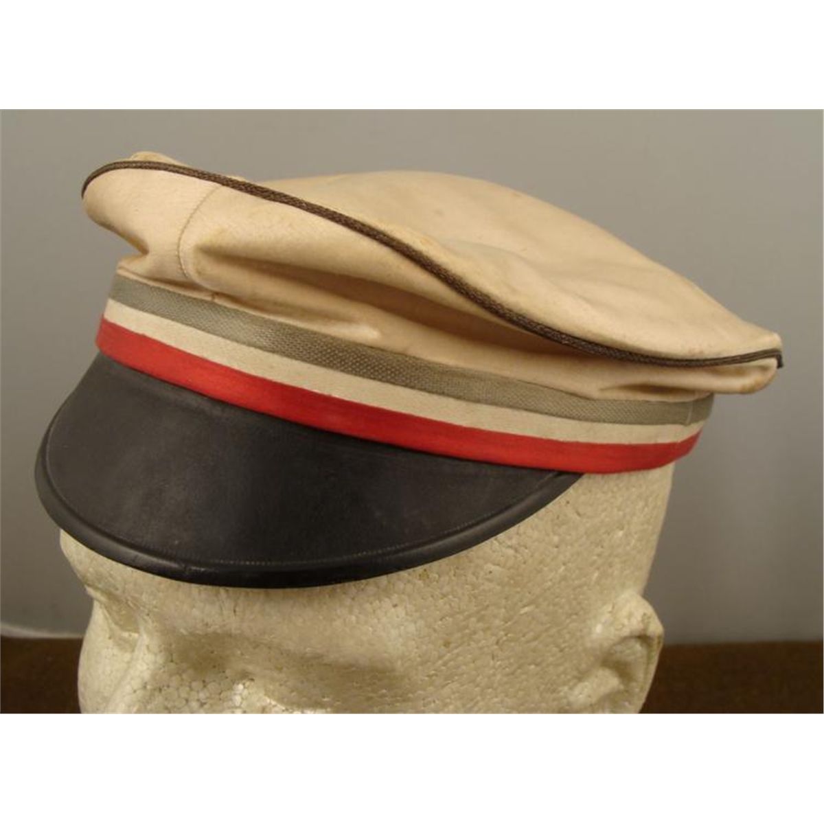 This is a WWI era German Military School Cap. It is all white silk, with leather sweat band, red, white and gray rim, black brim, blue piping, and white silk lining. The maker name Jacob Sperb, is inside. No size is marked, but it is about 20" around on the inside. Its condition is very good.