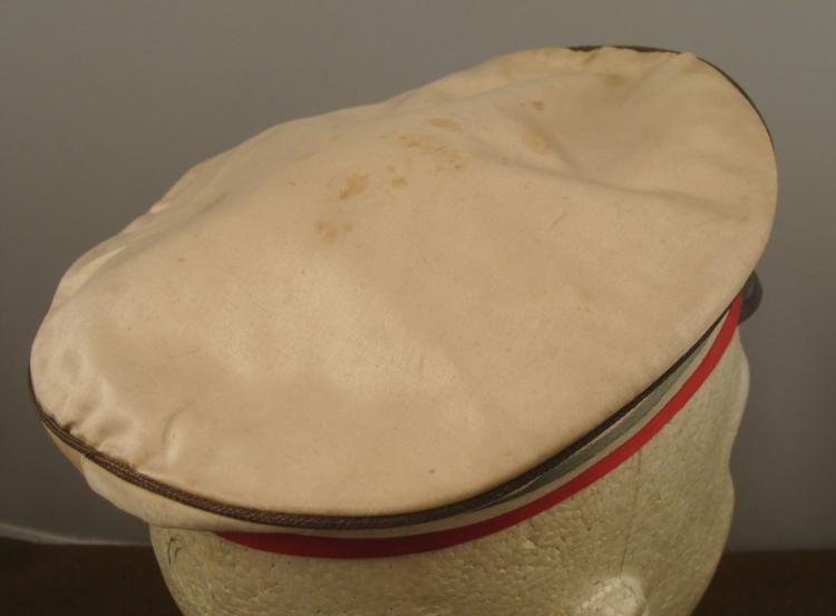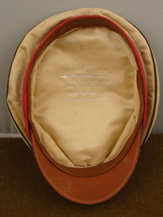 This is a WWI era German Military School Cap. It is all white silk, with leather sweat band, red, white and gray rim, black brim, blue piping, and white silk lining. The maker name Jacob Sperb, is inside. No size is marked, but it is about 20" around on the inside. Its condition is very good.