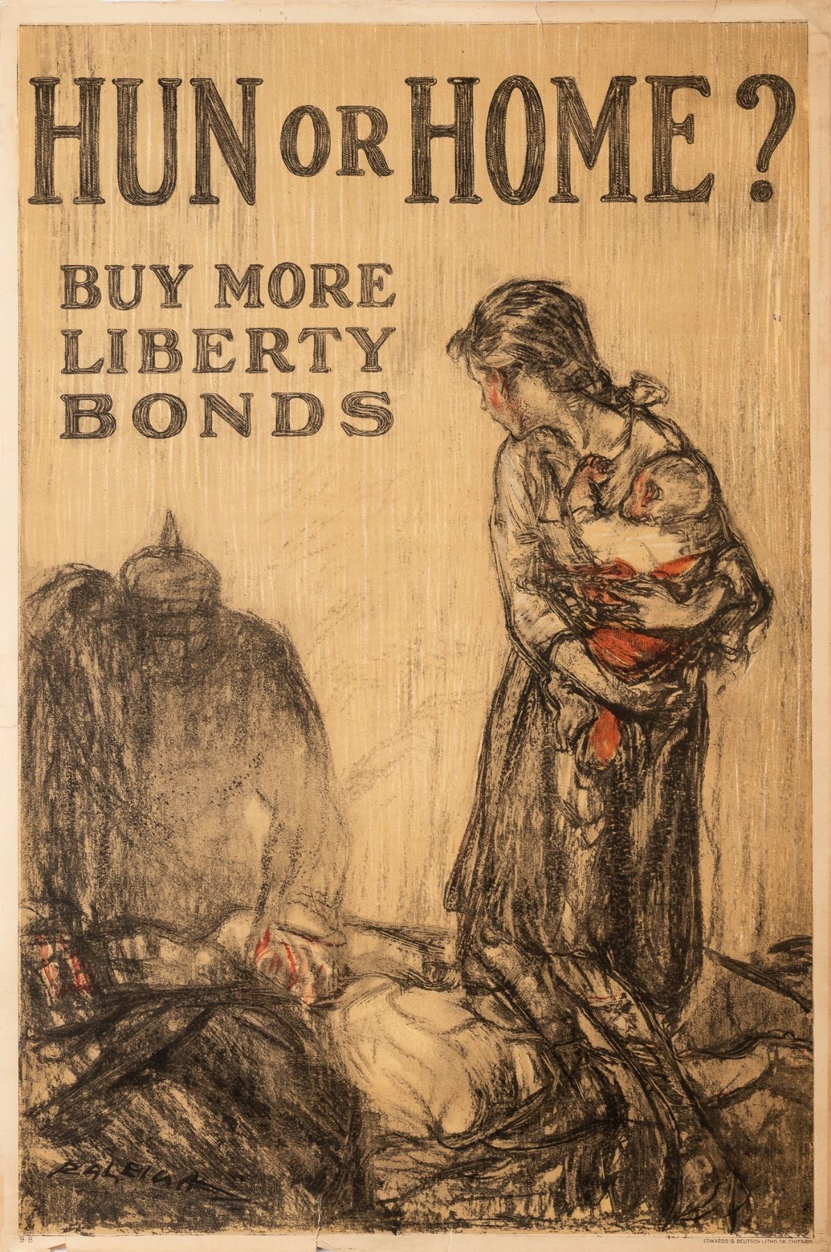'Hun or Home? Buy More Liberty Bonds', artwork by Henry Patrick Raleigh (1880-1944), Edwards & Deutsch, Litho., Chicago, 1918, 20 x 30 inches. Minor tears on edges and loss at upper right corner.