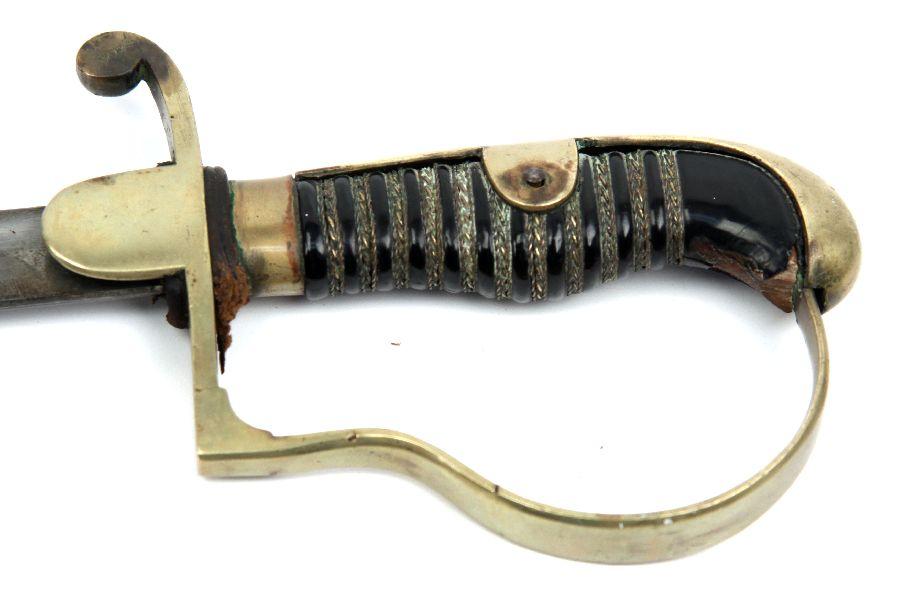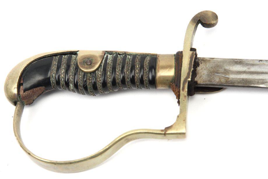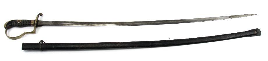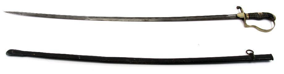 Imperial German Dovehead saber. 34 1/2 inch blade, with single fuller running 2/3 length. Makers marked Alcosa, Solingen on ricasso. Rolled steel black enameled scabbard with single hang ring. Mellow patina over blade with no rust. Small chip in wire wrapped bakelite grip, and langet on right side is missing. Some rust and minor dents on scabbard. Overall good condition.