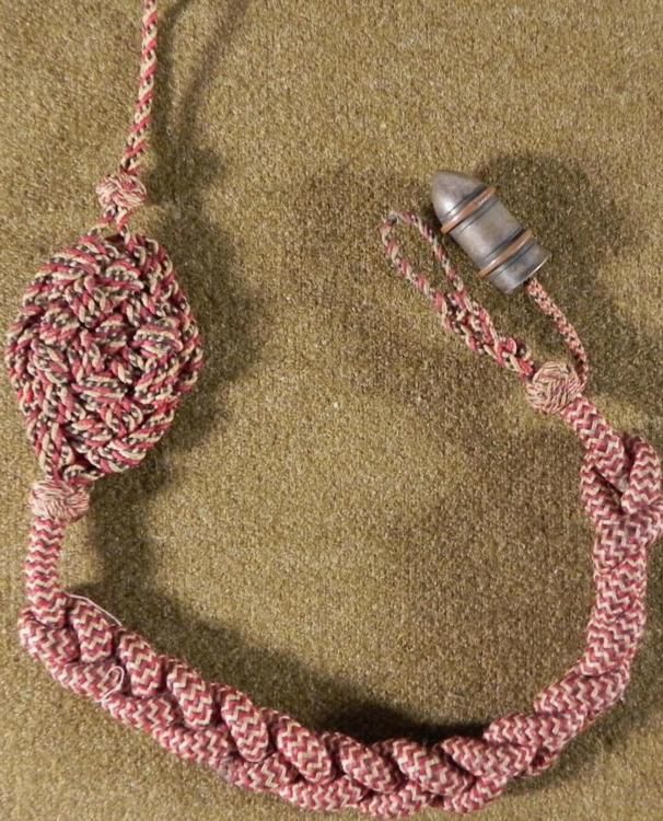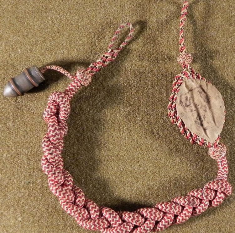 THIS IS A RARE WWI IMPERIAL GERMAN ORIGINAL SHARPSHOOTER'S LANYARDWITH A WOVEN BRAID. THERE IS A LOOP ON TOP &BOTTOM FOR ATTACHMENTWITH A HEAVY METAL BULLET THAT HANGS FROM THE BOTTOM.