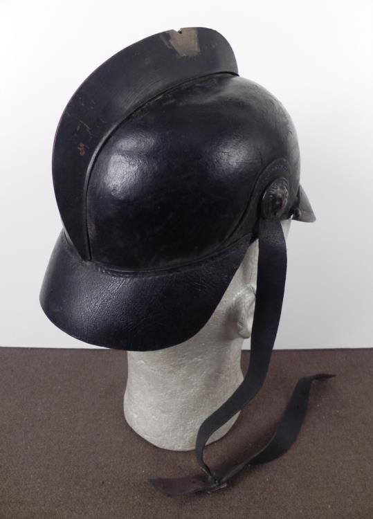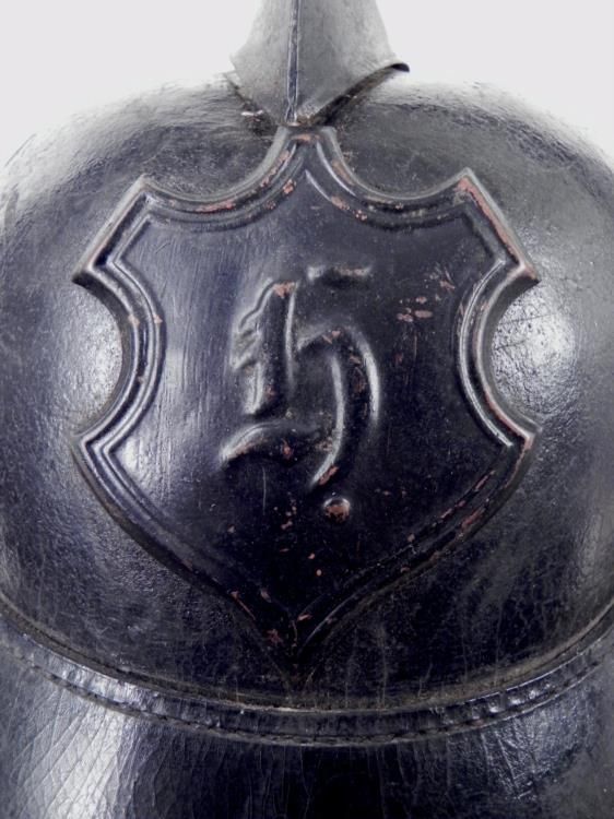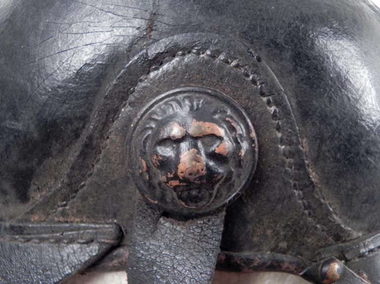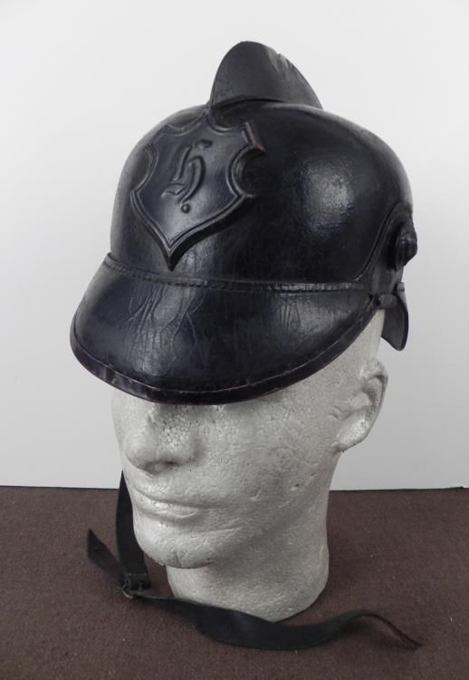 WWI IMPERIAL GERMAN WAR TIME FIRE HELMET FOR HEIDELBERG-LEATHER LEATHER HELMET DARKENED/PAINTED BRASS FURNITURE FOR WAR TIME HEIDELBERG GERMANY-CREST WITH "H" IN FRONT--CONE ON TOP-HAS FULL ORIGINAL LINER--SIDE LION BUTTONS HOLD CHINSTRAP THAT HAS COME L