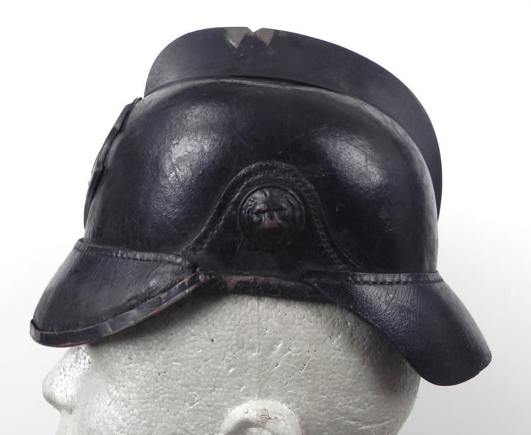 WWI IMPERIAL GERMAN WAR TIME FIRE HELMET FOR HEIDELBERG-LEATHER LEATHER HELMET DARKENED/PAINTED BRASS FURNITURE FOR WAR TIME HEIDELBERG GERMANY-CREST WITH "H" IN FRONT--CONE ON TOP-HAS FULL ORIGINAL LINER--SIDE LION BUTTONS HOLD CHINSTRAP THAT HAS COME LOOSE ON ONE SIDE-HELMET NEEDS SOME TLC