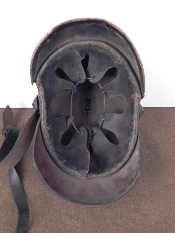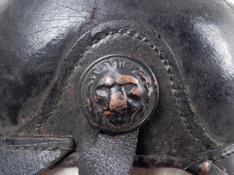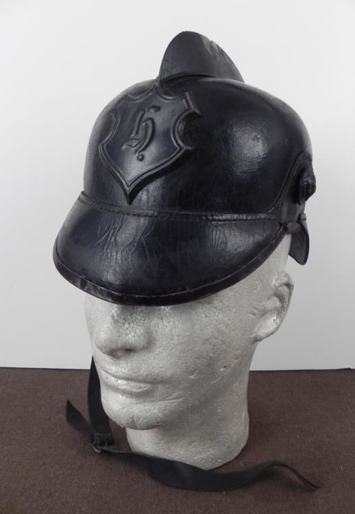 WWI IMPERIAL GERMAN WAR TIME FIRE HELMET FOR HEIDELBERG-LEATHER LEATHER HELMET DARKENED/PAINTED BRASS FURNITURE FOR WAR TIME HEIDELBERG GERMANY-CREST WITH "H" IN FRONT--CONE ON TOP-HAS FULL ORIGINAL LINER--SIDE LION BUTTONS HOLD CHINSTRAP THAT HAS COME LOOSE ON ONE SIDE-HELMET NEEDS SOME TLC
