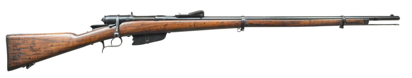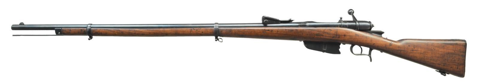 Cal.6.5x52mm (6.5 Carc.). S# AD6726 (1878). WWI conversion of 1870/87 Verterlli-Vitali model rifle to 6.5 Carcano; used for non combat roles. Bbl. 43" w/ right side bayonet lug, blade front sight & 2,000m tangent rear sight. Walnut stock w/ inletted wood repairs filling gap between mag. body models & sling swivels. Right side of buttstock has S# along w/ "S. POLOTTI / B FIGUI" STAMP. Left side of buttstock has worn roundell. CONDITION: good overall as arsenal refinished w/ handling marks & wear. Very good blue of prior pitting. Sanded & refinished stock has inlet wood repairs & sm. gouges. Fair bore w/ strong rifling. (01-20687/MD). ANTIQUE. $200-300.
